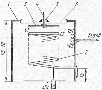 Для изготовления такого приемника необходимо в первую очередь сделать спиральный резонатор. Для него подойдет цилиндрическая металлическая банка из луженой жести, желательно с металлической крышкой. Конструкция приемника показана на рис. 4, он рассчитан на диапазон 88... 108 МГц. Использовалась банка 1 из-под кофе "Nescafe" диаметром 75 и высотой 70 мм. Спираль 2 намотана проводом ПЭВ-2 диаметром 2 мм, она содержит 6 витков. Намотка бескаркасная, диаметром 35 мм и длиной 36...40 мм. Количество витков желательно сделать чуть больше, чтобы при необходимости в дальнейшем провести подстройку укорочением спирали. Нижний конец провода пропускают через отверстие в боковой стенке, загибают и припаивают к внешней боковой стороне. На нижней или боковой стороне устанавливают разъем XS1 и центральный контакт соединяют со спиралью на расстоянии примерно 0,1...0,15 витка от начала намотки (не считая прямого отрезка провода). На внутренней стороне банки, ближе к концу спирали, распаивают диоды, а один из выводов через изоляционную втулку выводят наружу.