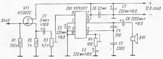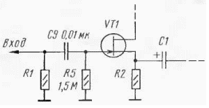 В устройстве можно применить следующие детали: полевой транзистор - КП303Г, Д, КП307А, Б; полярные конденсаторы - К50; неполярные - К10-17; переменный резистор - СП4, СПО; подстроечный - СП3-19; постоянные резисторы - МЛТ, С2-33. Литература