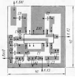 Все детали УЗЧ размещают на печатной плате из фольгированного стеклотекстолита, эскиз которой показан на рис. 6.