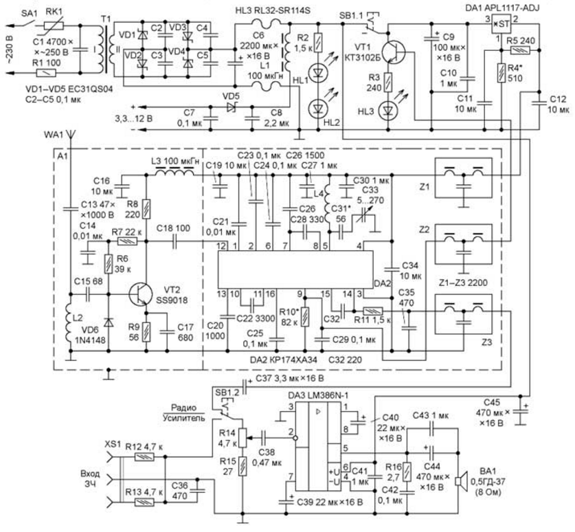 Вместо микросхемы КР174ХА34 можно применить К174ХА34, КР174ХА34А. К микросхеме LM386N-1 приклеивают медный теплоотвод с площадью охлаждающей поверхности не менее 3 см2. Вместо УЗЧ на этой микросхеме можно собрать другой усилитель, работоспособный при напряжении питания 3...12 В. Вместо микросхемы APL1117-ADJ можно установить любой интегральный стабилизатор серии 1117-ADJ в любом корпусе, кроме сверхминиатюрных, например, LD1117A-ADJ, IL1117A-ADJ. Также подойдет любой аналогичный стабилизатор с малым падением напряжения в соответствующей схеме включения. Вместо высокочастотного транзистора SS9018 подойдет любой из серий 2SC1730, 2SC1395, КТ368, КТ399, 2Т399, 2Т372, КТ372,2Т382, КТ382, КТ325,2Т325, КТ355, 2Т355. Транзистор КТ3102Б заменим любым из серий КТ312, КТ315, КТ3102, SS9014, PN2222, BC547, BC548. Упомянутые в вариантах замен транзисторы имеют отличия в цоколевке. Вместо диодов Шотки EC31QS04 можно установить SB140, SB150, SB160, 1 N5819, MBRS140T3. Диод 1 N4148 можно заменить на PMLL4148, PMLL4446, PMLL4448, КД503А. Светодиоды HL1, HL2 - сверхъяркие, для поверхностного монтажа, желтого цвета свечения (от подсветки кнопок автомагнитолы). Светодиод RL32-SR114S - красного цвета свечения, можно заменить любым непрерывного свечения без встроенных резисторов, желательно с возможно меньшим рабочим напряжением. Катушка L2 - бескаркасная, содержит 19 витков обмоточного провода диаметром 0,39 мм, намотанного на оправке диаметром 3 мм. Катушка L4 - бескаркасная, содержит шесть витков обмоточного провода диаметром 0,39 мм, намотанного на оправке диаметром 3 мм. Внутрь этой катушки вставлен кусок поролона, который затем пропитан парафином. Также парафином залит конденсатор C31. Дроссель L1 - готовый, промышленного изготовления, намотан на H-образном ферритовом магнитопроводе, сопротивление обмотки - не более 1 Ом, индуктивность - чем больше, тем лучше. Дроссель L3 - аналогичный, индуктивностью 100...1000 мкГн и сопротивлением обмотки 3...15 Ом. В узле питания применен трансформатор ТС6-2. Вторичная обмотка перемотана, она содержит 115 витков обмоточного провода диаметром 0,33 мм. Намотка - виток к витку, ни один виток не должен быть перехлестнут, иначе обмотка не уместится в окне. Вместо такого трансформатора подойдет, например, унифицированный ТП-112-1. WA1 - поворотная телескопическая антенна длиной 56 см. Отечественная динамическая головка 0,5ГД-37 отличается от подобных такого же размера хорошим качеством звучания и высокой чувствительностью. Можно заменить аналогичной 1ГДШ-6. Корпус динамической головки соединяют с общим проводом. Как сказано выше, переменный резистор применен штатный, имеющийся в нем выключатель питания не используется. Этот выключатель нельзя применять для коммутации напряжения сети 230 В. Подойдет любой переменный резистор сопротивлением 4,7- 22 кОм. Терморезистор ZPB53BL200C (RK1) применен от узла размагничивания кинескопа телевизора Funai. Может быть заменен ZPB53BL300C или другим с сопротивлением 20...30 Ом при комнатной температуре, или на полимерный самовосстанавливающийся предохранитель SF250-080. Резистор R1 - импортный невозгораемый или разрывной. Остальные резисторы - любого типа общего применения, в УКВ-модуле желательно использовать поверхностно монтируемые резисторы. Конденсатор C1 - керамический на номинальное напряжение не менее 1000 В постоянного тока или 250 В переменного тока. Конденсатор C38 - малогабаритный пленочный. Оксидные конденсаторы - импортные аналоги К50-68, К53-19. Остал
