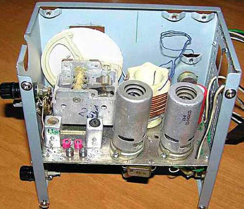 Двухступенчатый входной аттенюатор на переменном резисторе R1 обеспечивает нормальную работу приемника с любой, в том числе и полноразмерной антенной. Входной двухконтурный полосовой диапазонный фильтр (ПДФ) - L2L4C2-C8C10-C19 спроектирован по упрощенной схеме так, чтобы обеспечить максимальную чувствительность на диапазоне 10 метров. На диапазоне 80 метров ПДФ имеет повышенное затухание, чем уменьшается и некоторая избыточность усиления на этом диапазоне. Для диапазона 80 метров - это приемник прямого усиления 1-V-1 с регенеративным детектором и усилителем НЧ на лампе VL2 (пентод лампы VL1.2 работает как развязывающий УВЧ), а на остальных диапазонах - супергетеродин с переменной ПЧ и гетеродином с кварцевой стабилизацией частоты. Гетеродин выполнен на триоде лампы VL1.1 и кварцевом резонаторе ZQ1 по схеме емкостной трехточки (генератор Колпитца). На диапазонах 40 и 20 метров он работает на основной гармонике резонатора - 10,7 МГц, а на диапазоне 10 метров - на его третьей гармонике (32,1 МГц), для чего на этом диапазоне анодная нагрузка выполнена в виде резонансного контура L3C1, настроенного на частоту 32,1 МГц. На пентоде лампы VL1.2 собран смеситель. Диапазон перестройки регенеративного приемника, выполняющего в структуре супергетеродина роль тракта ПЧ, регенеративного детектора и УНЧ, выбран равным 3,3...3,8 МГц (диапазон 80 метров), что обеспечивает достаточное перекрытие и на ВЧ-диапазонах. Соответственно на диапазоне 40 метров перекрытие составит 6,9...7,4 МГц, на 20 метрах - 14...14,5 МГц, на 10 метрах - 28,3...28,8 МГц. Напряжения питания анодной цепи и накала ламп приемника должны быть стабилизированы. Вопрос - нужно ли стабилизировать напряжения питания (накальное и анодное) лампового регенератора часто возникает на разных ветках форумов сети, и ответы на него часто дают самые противоречивые - от ничего не надо стабилизировать и выпрямлять (и так все прекрасно работает) до обязательного применения полностью автономного, аккумуляторного, питания. И как это ни удивительно, справедливы высказывания и тех и других (!), важно только помнить основные критерии (или, если угодно, требования), которые предъявляют к регенератору и те, и другие авторы. Если основное - это простота конструкции, к чему стабилизация питания? Регенераторы 20-50-х годов (а это сотни разных конструкций), сделанные по такому принципу, прекрасно работали и обеспечивали вполне приличный прием, особенно на радиовещательных диапазонах. Но как только поставим во главу угла чувствительность, а она, как известно, достигает максимума на пороге генерации - точке крайне неустойчивой, на которую влияют многочисленные внешние изменения параметров, причем колебания напряжения питания одни из самых весомых, то и ответ становится очевиден. Хотите получить высокие результаты - напряжение питания надо стабилизировать. Приемник смонтирован в корпусе от старого компьютерного БП. Монтаж - навесной, выполнен на плате-шасси из фольгированного с двух сторон стеклотекстолита. Фольга одной из сторон разрезана на прямоугольники, которые служат контактными площадками, фольга противоположной стороны используется как общий провод. Требования к монтажу стандартные - максимальная жесткость крепления и минимальная длина ВЧ-про-водников. Приемник собран из недефицитных деталей. Все блокировочные и переходные конденсаторы должн