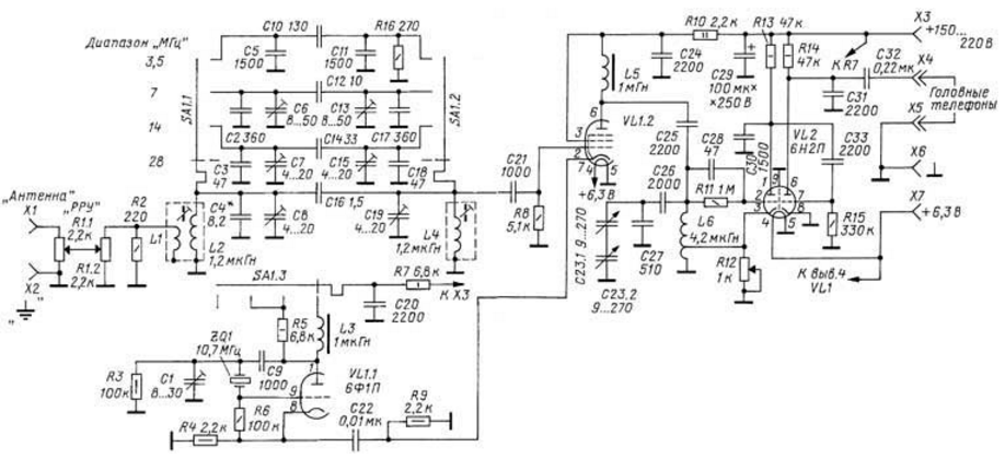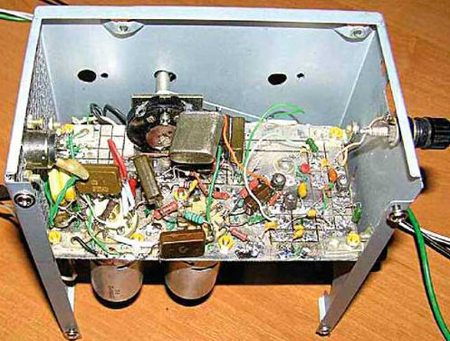ЭНЦИКЛОПЕДИЯ РАДИОЭЛЕКТРОНИКИ И ЭЛЕКТРОТЕХНИКИ Двухламповый супергетеродин. Энциклопедия радиоэлектроники и электротехники Энциклопедия радиоэлектроники и электротехники / Гражданская радиосвязь Тема ретроприемников, в частности регенеративных, всеобъемлющая и очень плодотворно развивается на многих сайтах в сети Интернет. В свое время она очень заинтересовала и меня. В результате возникла мысль сделать простой одноламповый регенератор, который в последующем "малой кровью" был преобразован в несложный, но многодиапазонный супергетеродин. За основу взята замечательная своей простотой и изяществом конструкция однолампового регенеративного приемника на двойном триоде 6Н9М (6Н9С) [1], который при повторении конструкции был заменен его современным аналогом 6Н2П. В процессе испытаний прототипа были сделаны некоторые доработки: - введена ООС во втором каскаде (УНЧ) и увеличена в первом (собственно регенераторе). Это стало возможно благодаря использованию специфической особенности триодов - относительно большой проницаемости или, если угодно, существенному влиянию анодной нагрузки на цепи сетка-катод. Анодные резисторы большого сопротивления создают достаточно большую "внутреннюю" ООС, эквивалентную внесению в катод сопротивления, равного Ra/ц, в нашем случае - это 47 кОм/100=470 Ом, что и обеспечивает высокую стабильность выбранного режима; - убрано высокое напряжение с головных телефонов (как-то жутковато осознавать, что на голову подается 200 В); - переходные и блокировочные конденсаторы теперь выполняют функции однозвенных фНч и ФВЧ, и их емкости подобраны так, чтобы обеспечить частотную полосу 300...3000 Гц тракта НЧ. В результате приемник обладает высокой стабильностью (на 80 метрах можно длительно слушать станцию без какой-либо подстройки!) и высокой чувствительностью, хорошей повторяемостью (благодаря ООС его параметры мало зависят от разброса характеристик ламп) и очень простым управлением. На базе этого регенератора и был построен двухламповый четырехдиапазонный супергетеродин. Фотографии его конструкции приведены на рис. 1 - рис. 3, а схема - на рис. 4. Радиоприемник позволяет принимать SSB и CW-сигналы любительских радиостанций на диапазонах 80, 40, 20 и 10 метров. Чувствительность приемника при приеме в телеграфном (автодинном) режиме и соотношении сигнал/шум, равном 10 дБ, - не хуже 1 мкВ (на 10 метрах), 0,7 мкВ (на 20 и 40 метрах) и 3 мкВ (на 80 метрах).