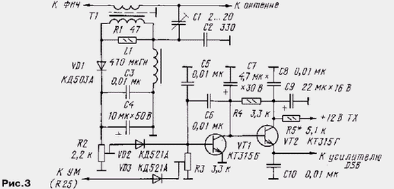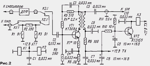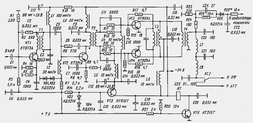 ЭНЦИКЛОПЕДИЯ РАДИОЭЛЕКТРОНИКИ И ЭЛЕКТРОТЕХНИКИ Усилитель мощности трансивера. Энциклопедия радиоэлектроники и электротехники Энциклопедия радиоэлектроники и электротехники / Гражданская радиосвязь Широкополосный транзисторный усилитель мощности позволяет заметно упростить конструкцию современного трансивера и обеспечить (в отличие от ламповых устройств) бесподстроечную работу оконечного каскада. Как сообщил автор статьи, этот ШПУ повторили несколько коротковолновиков, и у всех он работает безотказно. Намучившись с изготовлением и налаживанием нескольких вариантов ШПУ, я провел анализ схем выходных каскадов зарубежных трансиверов заводского изготовления, предназначенных для любительской радиосвязи, а также отечественной военной схемотехники аппаратуры аналогичного класса. В результате появился определенный подход к конструированию широкополосных транзисторных усилителей мощности коротковолновых трансиверов. Придерживаясь его при изготовлении ШПУ, радиолюбитель имеет больше шансов избежать неприятностей как при их настройке, так и при последующей эксплуатации. Вот основные положения этого подхода. 1. В ШПУ надо использовать транзисторы, специально созданные для линейного усиления в полосе частот 1,5...30 МГц (серий КТ921, КТ927, КТ944, КТ950, КТ951, КТ955, КТ956, КТ957, КТ980). 2. Выходная мощность устройства не должна превышать максимального значения мощности одного транзистора двухтактного ШПУ (в военной технике этот показатель не превышает 25% от максимальной мощности транзистора). 3. Предварительные каскады должны работать в классе А. 4. Транзисторы для двухтактных каскадов надо обязательно подбирать попарно. 5. Не следует стремиться получить максимальный коэффициент усиления (Кус ) от каждого каскада. Это повлечет за собой их неустойчивую работу. Целесообразнее ввести дополнительный каскад, а Кус остальных каскадов уменьшить отрицательными обратными связями. 6. Монтаж должен быть жестким, а выводы элементов должны иметь минимальную длину. Проще всего использовать монтаж на печатной плате с опорными площадками. 7. Экономия на блокировочных конденсаторах и развязывающих цепочках отрицательно сказывается на устойчивости работы усилителя в целом. 8. Экономия на размерах радиатора не оправдана. Здесь попытки "микроминиатюризации" аппаратуры обычно заканчиваются нервными стрессами с последующими материальными издержками. Номинальная выходная мощность предлагаемого усилителя при напряжении питания +24 В и напряжении возбуждения 0,5 В (эфф.) - около 100 Вт. Выходное сопротивление усилителя - 50 Ом, а входное - 8 10 Ом. Без дополнительной фильтрации уровень второй гармоники на выходе усилителя не превышает -34 дБ, а третьей - -18 дБ. Уровень комбинационных составляющих третьего порядка на пике огибающей двухтонового сигнала не превышает -36 дБ. Эти измерения проводились анализатором спектра СК4-59А. Ток потребления - до 9 А (при максимальной выходной мощности). Полоса рабочих частот - от 1,8 до 30 МГц. Усилитель успешно эксплуатировался в длительных тестах (без применения принудительного обдува). Три каскада усилителя мощности (рис. 1) размещены на общей плате размерами 165х85 мм, закрепленной непосредственно на задней стенке - радиаторе трансивера. В первом каскаде использован транзистор КТ913А. Его можно заменить на КТ904А, КТ911А. Ток покоя 