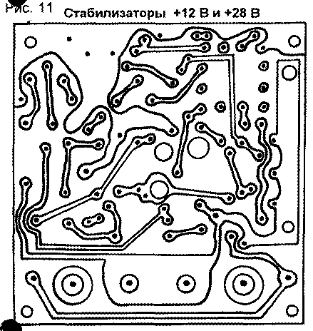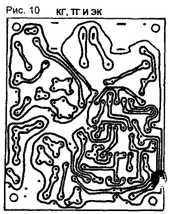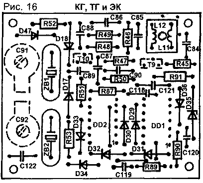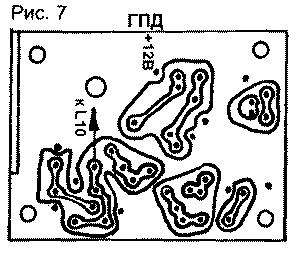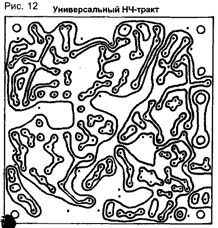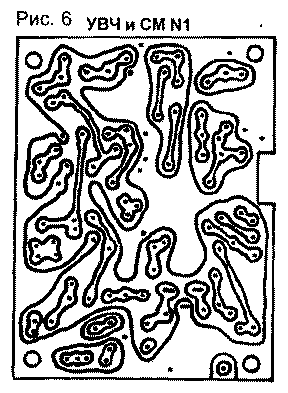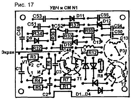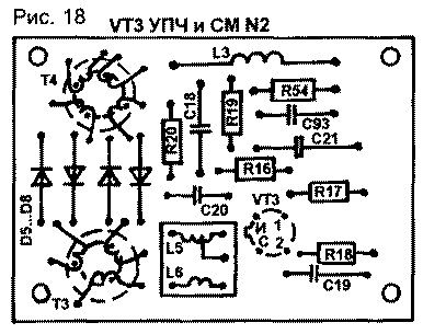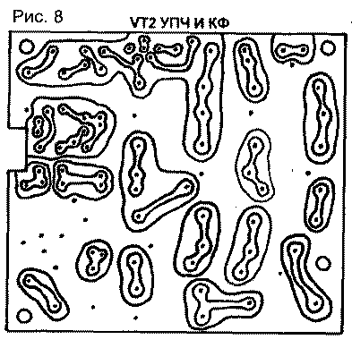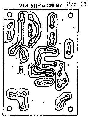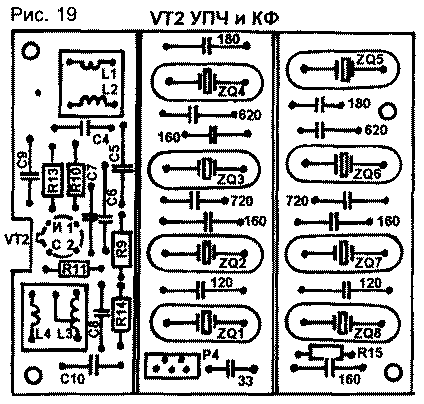 Чертежи печатных плат приведены на рис.7... 15, а размещение деталей на них - на рис. 16...24. Печатная плата УПЧ (А2) рассчитана на установку восьмикристального лестничного фильтра на 9 МГц [3].
