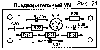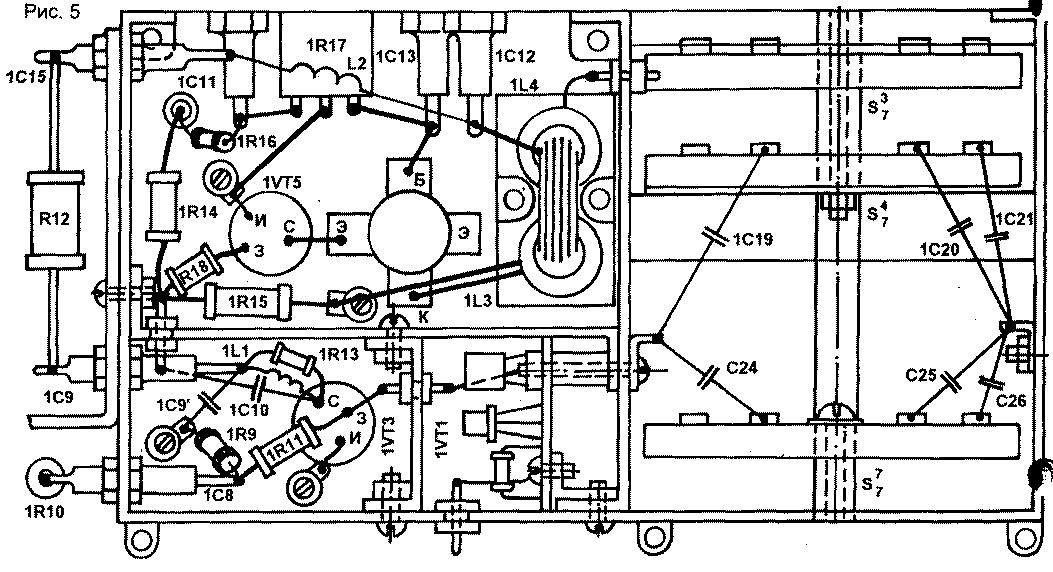 Первый каскад выполнен на печатной плате, остальные каскады - навесным способом в отсеках. Для подключения параллельно С16 емкостей С24...С27 использована дополнительная галета - S J [1, рис. 1]. Новый усилитель монтируется в отсеке усилителя мощности,