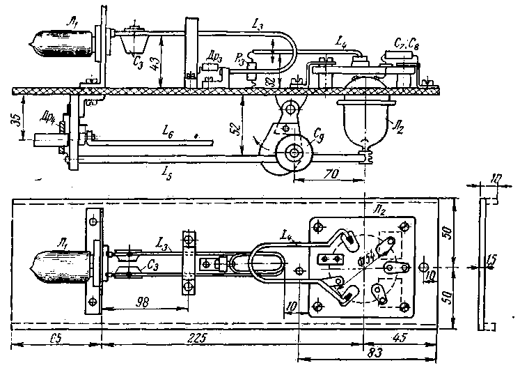Размеры отдельных деталей передатчика показаны на рис.4. Керамическая панель лампы ГУ-32 крепится на четырех стойках, их можно сделать из любого материала. При питании накала от 6,3 B, два крайних вывода нити соединяются вместе и широкой медной полоской заземляются на шасси. Такой же полоской с противоположной стороны заземляется катод ГУ-32. Такой монтаж уменьшает индуктивность в цепи катода и склонность каскада к самовозбуждению. Петля связи L4 в цепи сеток ГУ-32 3 сделана из медной 2 мм проволоки и припаивается непосредственно к лепесткам сеток на панельке лампы. Короткозамкнутый конец петли крепится на ячейке R3С4, с помощью которой создается необходимое смещение для лампы ГУ-32. Достаточная связь с контуром L3C3 задающего генератора получается при расстоянии катушки L4 от шасси порядка 32 мм. Над панелькой около выводов второй сетки и отвода накала лампы ГУ-32 расположены конденсаторы С7, C8 (KCO-2), которые заземляются на пластинку 2. Гасящее сопротивление R4, колеблется по величине от 5,1 ком до 30 ком в зависимости от напряжения источника питания. С обратной стороны шасси расположен анодный контур лампы ГУ-32, который крепится непосредственно на жестких выводах анодов лампы ГУ-32, и на планке из любого изолирующего материала. Анодная линия 4 сделана из 4 мм медного провода. На открытом конце провода надрезаются лобзиком, и в прорезь впаивается пружинящая контактная пластинка - зажим 5. На расстоянии 65 мм от конца линии к ней припаиваются две шайбы с резьбой М4 6, в которой крепятся передвижные статорные пластины 7 конденсатора С9. Круглые статорные пластины (медь, латунь) имеют в центре резьбу М3 для проходного винта 8 (М3). Пластина ротора 9 сделана из полоски меди 0,5 мм и крепится на пластине 10 из органического стекла или другого хорошего изолятора. Пластина 10 присоединяется двумя гайками к оси 11, вращающейся в стойке 12, которая крепится к основанию шасси под линией. Эта деталь аналогична во всем ранее описанному способу настройки у УКВ блока ("Радио" N 6, 1961 г.). Короткозамкнутый конец линии привинчивается винтом М2 к пластине 13 (отверстие). Эта пластина сделана из изолирующего материала и к шасси крепится угольником 14. На этой же пластине крепится петля связи с антенной и анодный дроссель (между точками A и Б). Размеры петли связи подбираются в зависимости от качества и свойств применяемой антенны ориентировочно, ее длина равна 100- 120 мм. Настройка и контроль работы В процессе настройки подбирается фиксированная рабочая частота путем изменения емкости С3 (рис.1а) в задающем генераторе. Нормальное расстояние между пластинами С3 около 1,2-1,1 мм и их незначительное изменение позволяет подобрать любую частоту в диапазоне 144-146 Mгц. Настройка эта ведется по градуированному приемнику или волномеру при включенном накале лампы ГУ-32. Для контроля за величиной возбуждения в цепь смещения сетки лампы ГУ-32 в цепь сетки включается миллиамперметр на 0-10 ма и связь петли L4 подбирается такой, чтобы остаточный ток был порядка 3-4 ма. После этого при включенных анодном и экранном напряжениях на ГУ-32 определяется резонанс анодного контура по спаду анодного тока или свечению неонового индикатора при изменении емкости С9. Если резонанс не удается найти, то изменяется расстояние между пластинами статора вращением винта 8 во втулке 6 (рис. 4). Новое положение статорных пластин фикс