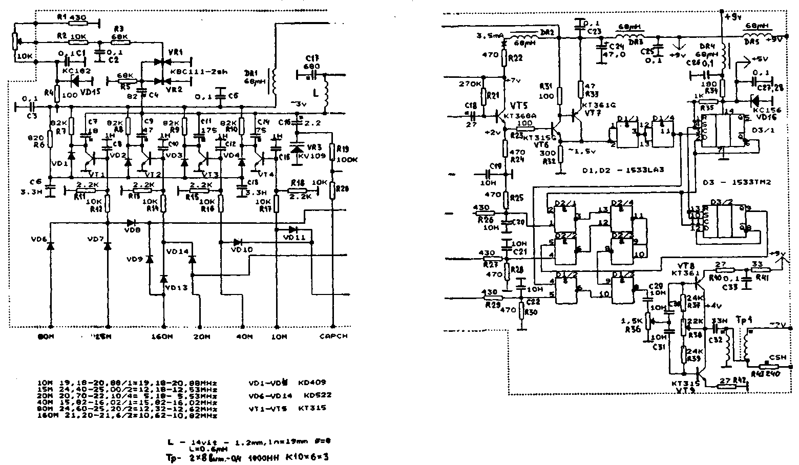 Энциклопедия радиоэлектроники и электротехники / Гражданская радиосвязь Надо признать, что первоначальная реализация ГПД выполнена не совсем удачно. Со временем выявились основные недостатки: плохая повторяемость и низкая стабильность частоты. Последующая, более тщательная проработка этого узла, позволила полностью устранить вышеперечисленные недостатки. Более того, новый вариант ГПД, приведенный на рис.1, можно рекомендовать для использования в составе практически любого трансивера там, где возникают проблемы, именно, с реализацией стабильности частоты. ГПД работает совместно с системой ЦАПЧ - цифровой автоподстройкой частоты. Рис.1 Схема модернизированного ГПД трансивера "YES-98M" За основу взята немного модернизированная схема генератора Колпитца, отличающаяся возможностью осуществления большей добротности колебательной системы, чем в широко известных схемах генераторов высокой частоты. Активный элемент ГПД - транзистор VT5 включен по схеме эмиттерного повторителя, за счет высокого входного сопротивления и небольшой емкости конденсатора С18, шунтирование колебательного контура незначительно. Генератор, собранный по схеме Колпитца, известен своей устойчивой генерацией, а две ветви отрицательной обратной связи: параллельная (резистор R24) и последовательная (резистор R21) обеспечивают работу транзистора VT5 в режиме генератора постоянного (термостабильного) тока. Малая емкость эмиттерного перехода транзистора КТ368А (около 2 пФ) и низкое выходное сопротивление каскада создают условия для хорошей развязки колебательной системы в целом от последующей нагрузки. Емкость коллектора VT5 (около 1,5 пФ) во много раз меньше конденсатора С17, и не оказывает влияния на колебательную систему. Использование малошумящего транзистора КТ368А (с нормированным коэффициентом шума) и вышеперечисленных особенностей способствует созданию генератора с хорошей термостабильностью и малым уровнем боковых (фазовых) шумов. После ряда проведенных экспериментов, для переключения диапазонов была выбрана схема подключения контурных конденсаторов с использованием коммутационных диодов КД409А и транзисторных ключей. В данном случае используются дешевые и распространенные транзисторы КТ315. Одновременным включением диода и транзистора достигается малое дифференциальное сопротивление коммутационной цепи (соединение контурного конденсатора с корпусом). Этим поддерживается высокая добротность колебательной системы, напрямую связанная с стабильностью генерируемой частоты. Емкость и дифсопротивление коммутационной цепочки ненамного больше тех же параметров обычного реле, но, несомненно, лучше по термостабильности. Для обеспечения хорошего отключения (при закрытом транзисторе), а также для получения минимальных переходных емкостей коммутационной цепи (на примере одной цепи VD1, VT1) запирающее напряжение +9 В подается через высокоомный резистор R7. Необходимый коммутационный ток через диод задается резистором R6. Использование достаточно высокоомных резисторов в базовой цепи транзистора (R11, R12, С8) создает условия для хорошей развязки генератора от коммутационного (диапазонного) напряжения, которое может быть и нестабильным (+9В). Эмиттерный повторитель на транзисторах VT6, VT7, имеющий низкое выходное сопротивление, имеет высокую нагрузочную спо