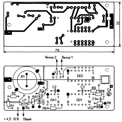 На микромощном ОУ DA1 собран компаратор, порог его переключения Uп устанавливают подстроечным резистором R4. В состоянии покоя на пряжение на инвертирующем входе ОУ DA1 превышает на 0,3...3 мВ напряжение на неинвертирущем, поэтому на его выходе установится низкий уровень - лог. 0. При появлении на пьезоэлементе В1 переменного напряжения с амплитудой, достаточной для переключения ОУ DA1, на его выходе формируется "пачка" импульсов, которые после инвертирования логическим элементом DD1.3 поступят на вход С счетчика DD2 и вход одновибратора (вывод 6 DD1.1), собранного на элементах DD1.1, DD1.2. Этот одновибратор формирует импульс длительностью Такт = 0.7*С1*R8 = 7 с, который задает временной интервал активной работы датчика - продолжительность цикла подсчета импульсов. По окончании этого интервала на выходе элемента DD1.4 формируется короткий (t = 0.7*R9*C3 = 14 мс) импульс, обнуляющий счетчик DD2. Поскольку сигнал высокого логического уровня (сигнал тревоги) на выходе 2П счетчика DD2 возникает лишь с поступлением в счетчик 2п-го импульса, порог срабатывания датчика зависит от того, какой из выходов этого счетчика задействован. Если это будет сделано так, как показано на рис. 3, то сигнал тревоги на "Выходе 1" возникнет с поступлением на вход С счетчика DD2 64-го импульса. Еще один выход датчика ("Выход 2") - открытый сток полевого транзистора VT1 - позволит подключить к нему нагрузку, имеющую собственный источник питания. Все элементы монтируют на печатной плате, изготовленной из двусторонне фольгированного стеклотекстолита толщиной 1,5 мм, чертеж которой показан на рис. 4. Часть фольги со стороны установки элементов используется в качестве общего провода. Подключения к ней "заземляемых" выводов резисторов, конденсаторов и других деталей показаны черными точками. В местах пропуска выводов элементов в этой фольге должны быть вытравлены защитные кружки диаметром около 2 мм (на рис. 4 не показаны). Места соединения металлизированных участков первой и второй сторон платы показаны черными квадратами со светлой точкой в центре.
