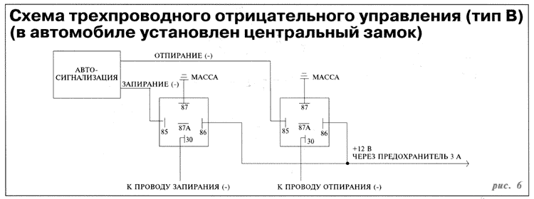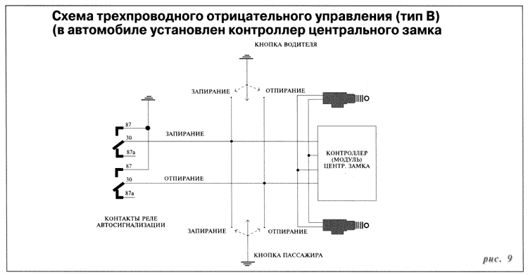Укажем на два простых варианта, которые могут быть полезными.А. На автомобиле не установлен центральный замок. Рекомендуется выбрать автосигнализацию со встроенным контроллером центрального замка, имеющим мощные выходы от контактов реле. Б. На автомобиле установлен центральный замок с отрицательным управлением, но требуется обеспечить управление им от автосигнализации. Рекомендуем выбрать автосигнализацию с маломощными отрицательными выходами для центрального замка. Тип A. Положительное управление Этот тип управления характеризуется положительной полярностью импульсов управления. На рис. 2 и 4 приведены схемы для автомобиля, в котором уже заводом-изготовителем установлен контроллер центрального замка, а сопряжение с автосигнализацией выполняется через встроенные в нее реле. На рис. 3 изображен вариант сопряжения с автосигнализацией, имеющей маломощные отрицательные выходы, которые подключены к дополнительным реле. Этот тип управления характерен для автомашин General Motors Corp., Renault, Chrysler, VW Passat и некоторых моделей Ford. Если посмотреть на установленный в двери водителя переключатель, управляющий замками, то от него будут отходить три провода: провод запирания, провод отпирания и положительный провод, постоянно соединенный с +12 В. Провода отпирания и запирания будут иметь потенциал +12 В во время запирания и отпирания замков. При подключении этих проводов к автосигнализации на них будет появляться кратковременный положительный потенциал (импульс). Тип B. Отрицательное управление Это - простейший стандартный тип управления замками дверей. Он используется в автомобилях Fiat, Lanchia, Volvo, Citroen, BMW (выпуска до 89 г.), Toyota, Honda и других. Если посмотреть на установленный в двери водителя переключатель, управляющий замками, то от него будут отходить три провода: провод запирания, провод отпирания и отрицательный провод, постоянно соединенный с массой. Провода отпирания и запирания будут иметь потенциал массы во время запирания и отпирания замков. При подключении этих проводов к автосигнализации на этих проводах будет появляться кратковременный отрицательный импульс массы. Схема на рис. 5 показывает подключение системы к автомобилю, не имеющему центрального замка и привода замков. Схемы на рис. 6, 7, 8 приведены для автосигнализаций с маломощными управляющими выходами, а рис. 9, 10 - для мощных выходов реле, встроенных в автосигнализацию. На рис. 7 показано, как выполнить подключение с защитой от отпирания задних дверей детьми. Примечания для автомобилей Toyota: многие модели этой фирмы имеют систему управления замками с дополнительной защитой, предотвращающей отпирание замков задних дверей детьми. При этом надо иметь в виду следующее: если замки дверей заперты командой автосигнализации, то они могут быть другой командой и отперты. Но если замки дверей заперты с помощью водительского дверного переключателя, а система защиты включена, то они не могут быть отперты командой автосигнализации. Это происходит потому, что переключатель защиты блокирует сигнал отпирания. Для выполнения правильного подключения необходимо использовать развязывающие диоды, установленные в цепи провода отпирания (рис. 7). Провод этой защиты может быть найден в общем разъеме проводки управления замками.