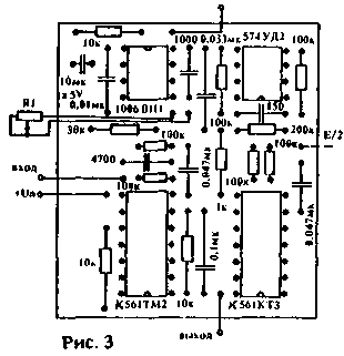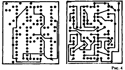 разные частоты преобразования. Расположение элементов устройства на плате и изображение ее двусторонней "печати" показано на рис. 3 и рис. 4 соответственно.