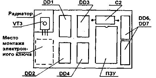 Конструкция сигнализатора может быть произвольной. В моем варианте это плата размером 75х45 мм, помещенная в корпус 80х50х20 мм. Излучатель находится внутри корпуса, но может быть и выносным. Транзистор VT3 установлен на радиаторе (размерами 20х15х4 мм). Часть соединений выполнена печатным монтажом, часть - проводом МГТФ, некоторые детали припаяны к ножкам ИМС. Расположение деталей показано на рис.2.