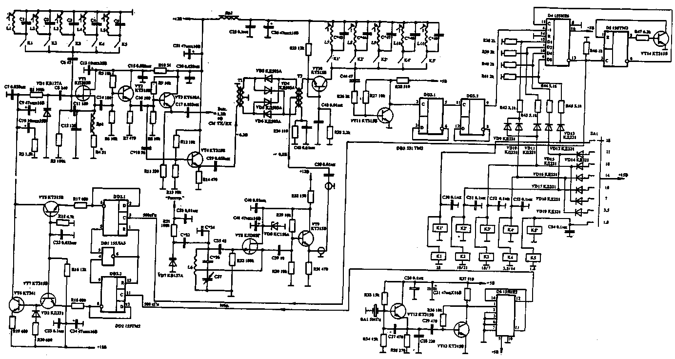 Кварцевый генератор собран на транзисторе VT12, он работает на частоте 5 МГц. На транзисторе VT13 собран формирователь импульсов, которые делит на 10 микросхема D6. На выходе ее получается напряжение образцовой частоты 500 кГц. Собственно, не обязательно применять кварц на 5 МГц, можно использовать кварц на 1 МГц, 2 МГц, при этом вместо микросхемы К155ИЕ2 можно включить делитель на 2 или 4 соответственно на микросхеме К155ТМ2. Впрочем, сосем не обязательно сравнивать именно на 500 кГц, только при этом нужно пересчитать Кдел. ДПКД и частоту работы ГПД. ФД собран на микросхемах D 1, D2 и транзисторах VT5, VT6, VT7. Много различных схем ФД было опробовано в СЧ, но приведенная на рис.2 оказалась лучшей из всех по захвату и удержанию частоты. Схема ФД полностью взята из [2]. Стабильность СЧ полностью определяется стабильностью ГПД, схема которого традиционна и особенностей не имеет. Все методы стабилизации частоты ГПД описаны достаточно хорошо в литературе [1 - 3]. Единственное, что требуется - это установить предел перестройки конденсаторами С34, С36, С37 4,5-6,2 МГц. Конденсатором С32 подбирают требуемое значение расстройки. Смонтирован синтезатор на печатной плате из двустороннего стеклотекстолита размерами 120 х 80 мм. Требования к монтажу те же, что к любой цифровой технике. Катушки L1 - L5 и L7 - L11 намотаны на каркасах от ПЧ транзисторных приемников, снабженных экранами и сердечниками. Данные частоты настройки контуров приведены в табл.2. Таблица 2