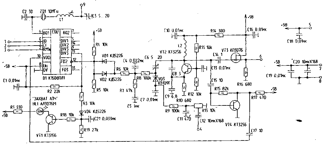 На вход микросхемы D1 - 10 (VCO) необходимо подавать напряжение от генератора, управляемого напряжением (ГУНа) уровнем не менее 1 В. Принципиальная схема синтезатора частот. Рис.2 Частота сравнения выбрана равной 12,5 кГц и равна дискрету перестройки синтезатора по диапазону. Таким образом весь диапазон 144 - 146 МГц разбит на 160 дискретных частот или каналов. Загрузка микросхемы D1 типа К1508ПЛ1 производится через выводы 2, 3,4 как было описано выше. Кварцевый резонатор ZQ1 - на частоту 10 МГц. Конденсатор С3 служит для точной установки частоты сравнения. На вход 10 микросхемы можно подавать сигнал с частотами до 200 МГц, причем при входной частоте 200 МГц его амплитуда может снижаться с 1 В до 100 мВ. На выходе фазового детектора микросхемы D1 включены диоды VD1 и VD2 для уменьшения нелинейных искажений при модуляции по частоте. Линейно-интегрирующий фильтр на элементах R7, С5, С4 определяет время перестройки синтезатора с одной частоты на другую. Оно составляет около 50 мс. На транзисторе VT1, диоде VD4, светодиоде HL1 типа АЛ307БМ построен индикатор захвата кольца захвата фазовой автоподстройки частоты (ФАПЧ). Транзистор VT1 -типа КТ315Б. При захвате ФАПЧ светодиод гаснет. С линейно-интегрирующего фильтра напряжение рассогласования по частоте подается на варикап VD3 типа КВ109Г. ГУН построен на транзисторе VT2 типа КТ325Б по схеме с общей базой. Такая схема является более широкополосной и выдает большую амплитуду сигнала по сравнению со схемой общий эмиттер. Буферный усилитель ГУНа для микросхемы DA1 построен на резистивном усилителе на транзисторе VT4 типа КТ325Б. Модулирующее напряжение на варикап VD3 подается через вывод 4 платы. Выходное напряжение синтезатора на приемник и усилитель мощности радиостанции снимается с истока транзистора VT3 типа КП307Г. Принципиальная схема контроллера синтезатора частоты. Рис.3 Он построен на микропроцессоре типа K1830BE31, выполненном также по КМОП технологии. Клавиатура контроллера содержит 16 кнопок S1...S16, которыми устанавливается номер канала от 0 до 160 при предварительном нажатии кнопки "канал" - "К". Кнопки "<-" и "->" служат для смещения на один канал ниже или выше по частоте. При длительном удержании этих кнопок производится быстрая перестройка по каналам. При нажатии кнопки "СК" осуществляется сканирование каналов, начиная с установленного и выше по частоте. Процесс сканирования носит кольцевой характер. На каждом канале синтезатор задерживается на 5 секунд. При повторном нажатии на любую из кнопок сканирование прекращается на канале, установленном на текущий момент времени. В контроллере имеется возможность записи до 10 выбранных каналов при нажатии кнопки "П". Нажатие на кнопку "П" -после каждого набора запоминаемого канала. При этом набранным каналам присваиваются номера от 0 до 9. Чтобы теперь установить один из заранее подготовленных каналов, необходимо просто нажать одну из кнопок с соответствующей цифрой. Для смены подготовленного канала необходимо нажать кнопку с другой цифрой. Кнопка "СКП" позволяет осуществлять сканирование предварительно выбранных каналов. В момент записи номера канала загорается светодиод HL2 "Запись" типа АЛ307БМ. Индикатор номера канала построен на светодиодных матрицах HG1... HG3 типа АЛС324А. При отсутствии нажатия на клавиатуру в течение 3-х минут происходит гашение индикации путем отключения регистров D7, D8 и инд