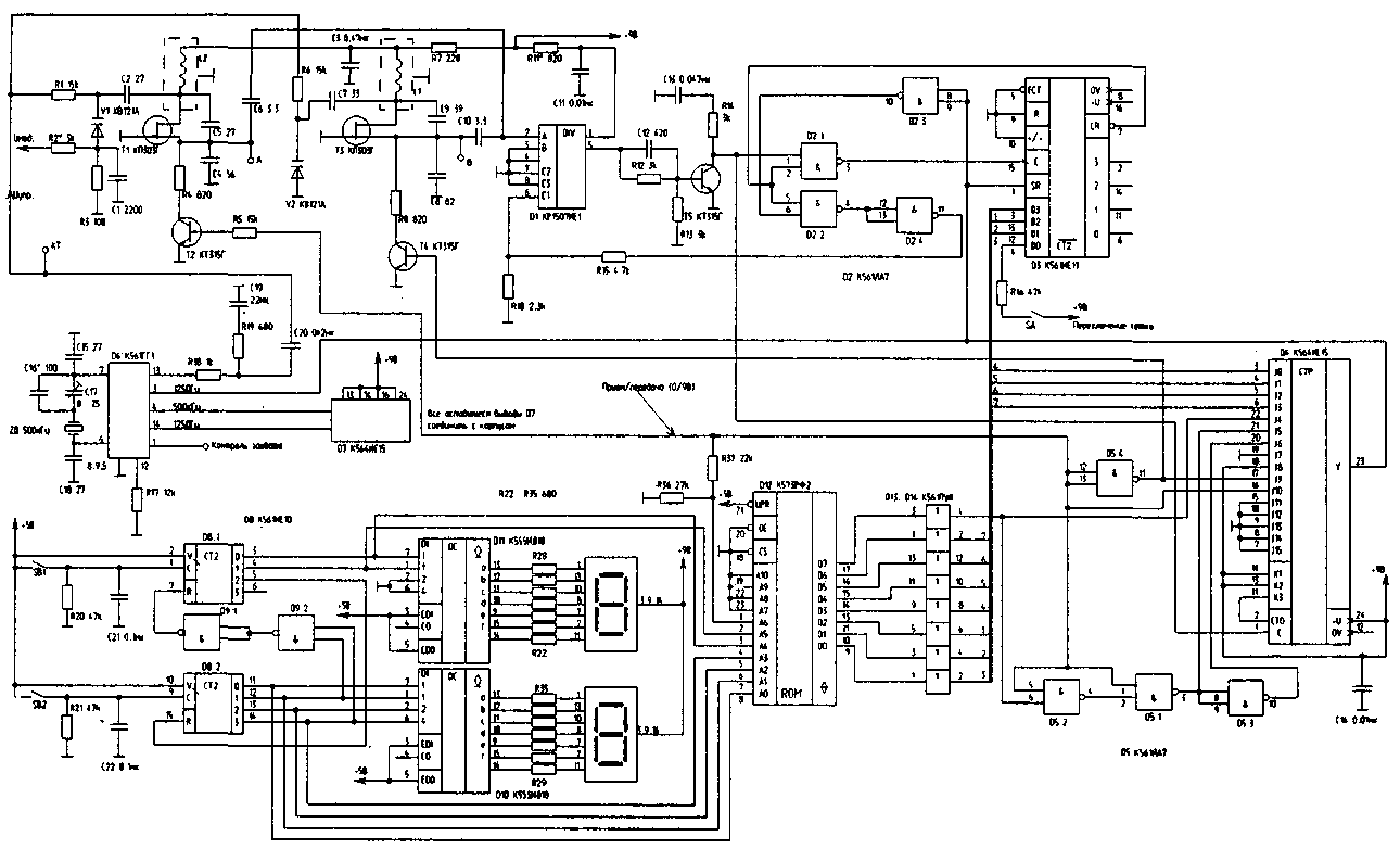 Энциклопедия радиоэлектроники и электротехники / Синтезаторы частоты Данный синтезатор частот (СЧ), показанный на рис. 1, использован в автомобильной радиостанции с двойным преобразованием частоты. Первая ПЧ имеет стандартное значение 10,7 МГц. СЧ вырабатывает стандартную 40 канальную сетку частот для работы передатчика и необходимую сетку гетеродинных частот для работы первого смесителя приемника. В данной конструкции предусмотрено смещение сетки на 5 кГц. Рабочий диапазон в режиме передачи 26975...27365 кГц (26970...27360 кГц) (вход А). Рабочий диапазон в режиме приема - 16275...16665 кГц (16270...16660кГц) (выход В). Шаг сетки- 10 кГц. Уровень модулирующего НЧ напряжения - 300...900 мВ. Крутизна характеристики управления - 300 кГц/В. Время перестройки частоты: не более 100 мс. Хотя на сегодняшний день имеются однокристальные СЧ, все они имеют динамическое управление и предполагают запись многоразрядного слова в последовательном коде. При этом схема управления для таких синтезаторов получается довольно сложной и содержит - 14 - 16 корпусов серии 561 для устройства, подобного приведенному в статье. По сравнению с другими подобными конструкциями СЧ, включая опубликованные в "РЛ", данная конструкция обладает наибольшим отношением эффективность/затраты. Данный СЧ представляет собой однопетлевое кольцо фазовой автоподстройки частоты (ФАПЧ) с импульснофазовым детектором с тремя состояниями (ИЧФДЗ). Управляемый генератор (УГ) для работы на передачу собран на Т1 по схеме емкостной трехточки и включается при открывании Т2. Сигнал через С6 поступает на делитель с переключаемым коэффициентом деления (ДПКД), который образован элементами D1, D2, D3, D4. Коэффициент деления ДПКД M=4x(10N+A). Число A зaдается на управляющих входах D3 в двоично-десятичном коде. Число N устанавливается на входах D4. Составными частями ДПКД являются: высокочастотный предварительный делитель на 40/44, программируемый счетчик D3, низкочастотный делитель D4. Сигнал с УГ вначале поступает на D 1, который в зависимости от сигнала управления работает в режиме деления на 40 или 44. С выхода D1 (вывод 5) импульсная последовательность поступает на преобразователь уровня ЭСЛ -> КМОП, собранный на Т5, и затем через схему блокировки (D2) подается на счетный вход программируемого счетчика D3. С помощью счетчика D3 происходит управление делителем D1. На D6 собран опорный генератор (ОГ), вырабатывающий колебания 500 кГц. На этом же элементе собран ИЧФДЗ. На элементе D7 собран делитель сигнала ОГ до значения Fоп=1250Гц. Сигнал с выхода ДПКД и опорное колебание 1250 Гц поступают на вход ФД. В зависимости от соотношения фаз на выходе ФД (вывод 13 D6) появляется управляющее напряжение (Uупр), которое через ФНЧ (R18, R19, С19, С20) воздействует на варикап V1 (V2) УГ и подстраивает его так, что бы фазовое рассогласование свести к минимуму. В режиме захвата частота УГ будет точно равна Fуг=FопM и ее нестабильность не будет превышать нестабильности кварцевого генератора. Схема управления и индикации собрана на элементах D8, D9, D10, D11, HG1, HG2, D12, D13, D14. Кнопка SB1 управляет счетчиком младших разрядов, a SB2 - старших, что удобно при поиске нужного канала. Все кодовые комбинации, необходимые для управления СЧ, записаны в РПЗУ D12. Настройка СЧ сводится к точной установке частоты 500 кГц конденсаторами С16, С17. Катушками L2 (в режиме передачи) и L1 (в режиме приема) необходимо выставить Uупр=4,5 В в то