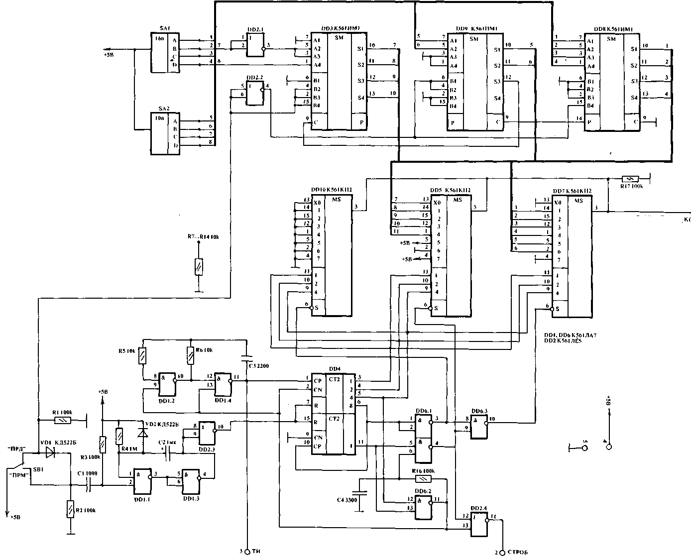 Перезапись информации из приемного регистра микросхемы в ее буферный регистр осуществляется подачей импульса положительной полярности на вывод 7 после прихода на вывод 5 двадцатого информационного разряда. На вывод 6 микросхемы поступают такты для записи информации в приемный регистр. Первый разряд регистра определяет коэффициент деления ДФКД. Если он установлен равным 0, то его коэффициент деления равен 1024, если 1 - то 2560. Разряды со 2 по 8 определяют коэффициент счета поглощающего счетчика, а разряды с 9 по 20 - коэффициент деления ДПКД. Первым вводится в микросхему 20 разряд, последним - 1. Генератор С4, управляемый напряжением (ГУН), выполнен по схеме емкостной трехточки с общей базой на транзисторе VT2 типа КТ316Д. Перестройка его частоты осуществляется варикапом VD2 типа КВ109Б. С ГУ На сигнал поступает на усилители на транзисторах VT3 и VT4 типа КТ399А. С выхода транзистора VT4 сигнал через емкости С24 и С25 поступает на приемник и передатчик соответственно. С выхода усилителя на транзисторе VT3 сигнал приходит на делитель частоты 64/65, выполненный на микросхеме DD1 типа КФ193ПЦ8. С вывода 2 этой микросхемы предварительно поделенный сигнал рабочей частоты попадает на микросхему DD2 типа КР1015ХК2, выполняющую роль ДПКД, ДФКД, ИЧФД и имеющую в своем составе элементы ФНЧ. Опорный генератор также построен на этой микросхеме. Его частота определяется кварцевым резонатором ZQ1 на частоту 12,800МГц. Таким образом, при записи "1" в первый разряд регистра управления микросхемы DD2 эта частота будет делиться до частоты 12,5 кГц, на которой и происходит сравнение. Сигнал с ИЧФД через вывод 16DD2 поступает на ФНЧ на элементах С7, С8, R4, который определяет полосу захвата и полосу удержания системы ФАПЧ. При элементах, указанных на схеме, полоса захвата ФАПЧ будет около 15 МГц, а время установления около 250 мс. Далее управляющее напряжение через резистор R6 и катушку L1 поступает на варикап VD2 и осуществляет перестройку ГУН. С вывода 1 микросхемы DD2 сигнал, фиксирующий срыв слежения ФАПЧ, подается на детектор на диоде VD1 типа КД522Б и далее - на ключ на транзисторе VT1 типа КТ315Б, который управляет светодиодом. При захвате кольца ФАПЧ светодиод HL1 будет погашен. Запись информации в микросхему DD2 осуществляется через вывод 1 платы, а тактовая частота и стробирующий сигнал подаются через выводы 3 и 2 платы соответственно. Модулирующее напряжение поступает на вывод 4 платы и далее через ФНЧ на элементах С12, R8, С14 - на варикап VD2, где осуществляется частотная модуляция. Необходимую девиацию частоты можно выставить резистором R7. Для записи кода частоты в регистр микросхемы DD2 СЧ и управления коммутацией "прием-передача" служит блок управления, показанный на рис.3. Принципиальная схема блока управления. Рис.3 Работа блока управления основана на том, что на входах мультиплексоров DD5, DD7, DD10 типа К561КП2 устанавливается необходимый код частоты и далее, в последовательном виде, выдается через вывод 1 платы. Так как мультиплексор DD10 служит для выдачи восьми нулей, то его с успехом можно заменить истоковым повторителем на транзисторе КП303В, но при построении подобного синтезатора на диапазон 430...470 МГц он понадобится. Номер необходимого канала устанавливается на переключателях SA1 и SA2, причем переключатель SA1 имеет 16 положений, а переключатель SA2 -10. Переключателем SA2 выставляют номер группы каналов, а перекл