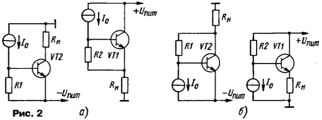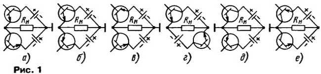 Последний из отмеченных недостатков ограничивает выходную мощность, особенно при низких напряжениях питания; выход из положения - параллельное включение транзисторов и введение ООС. Следует отметить, что в последнее время зарубежными фирмами (например, Exicon и др.) разработано немало полевых транзисторов, пригодных для аудиоаппаратуры: EC-10N20, 2SK133-2SK135, 2SK175, 2SK176 с каналом п-типа; ЕС-10Р20, 2SJ48- 2SJ50, 2SJ55, 2SJ56 с каналом р-типа. Такие транзисторы отличаются слабой зависимостью крутизны (forward transfer admitance) от тока стока и сглаженными выходными ВАХ Параметры некоторых полевых транзисторов, в том числе и производства Минского производственного объединения "Интеграл", приведены в табл. 1. Большинство транзисторных бестрансформаторных УМЗЧ выполнены по полумостовой схеме. При этом нагрузка включается в диагональ моста, образованного двумя источниками питания и двумя выходными транзисторами усилителя (рис. 1). Когда комплементарных транзисторов не было, выходной каскад УМЗЧ выполняли преимущественно на транзисторах одинаковой структуры с нагрузкой и источником питания, соединенными с общим проводом (рис. 1,а) Два возможных варианта управления выходными транзисторами представлены на рис. 2. В первом из них (рис. 2,а) управление нижним плечом выходного каскада оказывается в более выгодных условиях. Так как изменение напряжения питания мало, эффект Миллера (динамическая входная емкость) и эффект Эрли (зависимость тока коллектора от напряжения эмиттер-коллектор) практически не проявляются. Цепь управления верхним плечом включена здесь последовательно с самой нагрузкой, поэтому без принятия дополнительных мер (например, каскодного включения приборов) указанные эффекты проявляются в значительной степени. По этому принципу был разработан ряд удачных УМЗЧ [1-3]. По второму варианту (рис. 2,6 - такой структуре больше соответствуют МДП-транзисторы) также был разработан ряд УМЗЧ, например [4, 5]. Однако и в таких каскадах трудно обеспечить, даже с применением генераторов тока [5], симметрию управления выходными транзисторами. Другой пример симметрирования по входному сопротивлению - выполнение плеч усилителя по квазикомплементарной схеме или применение комплементарных транзисторов (см. рис. 1,б) в [6]. Стремление к симметрированию плеч выходного каскада усилителей, выполненных на транзисторах одной проводимости, привело к разработке усилителей с незаземленной нагрузкой по схеме рис. 1,г [7-9]. Однако и здесь не удается добиться полной симметрии предыдущих каскадов. Цепи отрицательной ОС с каждого плеча выходного каскада неравнозначны; цепи ООС этих каскадов [7, 8] контролируют напряжение на нагрузке по отношению к выходному напряжению противоположного плеча. Кроме того, такое схемотехническое решение требует изолированных источников питания. Из-за перечисленных недостатков оно не нашло широкого применения. С появлением комплементарных биполярных и полевых транзисторов выходные каскады УМЗЧ преимущественно строят по схемам рис. 1,б, в. Однако и в этих вариантах для раскачки выходного каскада необходимо применять высоковольтные приборы. Транзисторы предвыходного каскада работают с большим коэффициентом усиления по напряжению, а поэтому подвержены эффектам Миллера и Эрли и без общей ООС вносят значительные искажения, что требует от них высоких динамиче