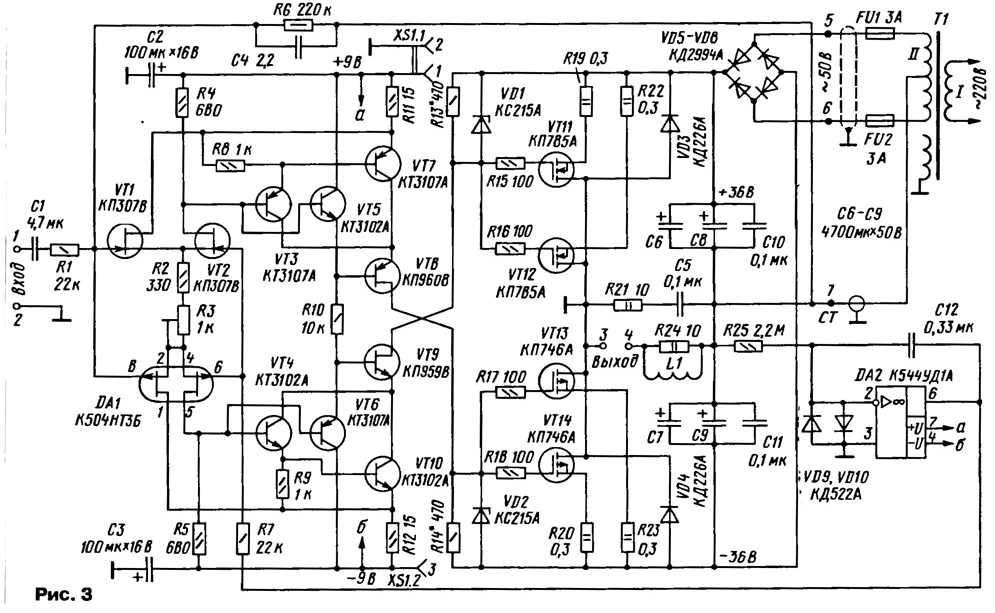 ЭНЦИКЛОПЕДИЯ РАДИОЭЛЕКТРОНИКИ И ЭЛЕКТРОТЕХНИКИ УМЗЧ с комплиментарными полевыми транзисторами. Энциклопедия радиоэлектроники и электротехники Энциклопедия радиоэлектроники и электротехники / Усилители мощности транзисторные Представляем читателям вариант стоваттного УМЗЧ с полевыми транзисторами. В этой конструкции корпусы мощных транзисторов можно монтировать на общем теплоотводе без изоляционных прокладок, и это существенно улучшает теплопередачу. В качестве второго варианта блока питания предложен мощный импульсный преобразователь, который должен иметь достаточно малый уровень собственных помех. Применение полевых транзисторов (ПТ) в УМЗЧ до недавних пор сдерживалось скудным ассортиментом комплементарных транзисторов, а также их низким рабочим напряжением. Качество звуковоспроизведения через УМЗЧ на ПТ часто оценивают на уровне ламповых и даже выше за то, что по сравнению с усилителями на биполярных транзисторах они создают меньшие нелинейные и интермодуляционные искажения, а также имеют более плавное нарастание искажений при перегрузках. Они превосходят ламповые усилители как по демпфированию нагрузки, так и по ширине рабочей полосы звуковых частот. Частота среза таких усилителей без ООС значительно выше, чем у УМЗЧ на биполярных транзисторах, что благоприятно сказывается на всех видах искажений. Нелинейные искажения в УМЗЧ вносит в основном выходной каскад, и для их уменьшения обычно используют общую ООС. Искажения во входном дифференциальном каскаде, используемом как сумматор сигналов от источника и цепи общей ООС, могут быть и невелики, но с помощью общей ООС снизить их невозможно Перегрузочная способность дифференциального каскада на полевых транзисторах примерно в 100...200 раз выше, чем с биполярными транзисторами. Применение полевых транзисторов в выходном каскаде УМЗЧ позволяет отказаться от традиционных двух-и трехкаскадных повторителей по схеме Дарлингтона с присущими им недостатками. Хорошие результаты дает использование в выходном каскаде полевых транзисторов со структурой металл-диэлектрик-полупроводник (МДП). В связи с тем, что управление током в выходной цепи осуществляется входным напряжением (аналогично электровакуумным приборам), то при больших токах быстродействие каскада на полевых МДП-транзисторах в режиме переключения достаточно высокое (τ = 50 нс). Такие каскады обладают хорошими передаточными свойствами на высоких частотах и имеют эффект температурной самостабилизации. К достоинствам полевых транзисторов относятся: