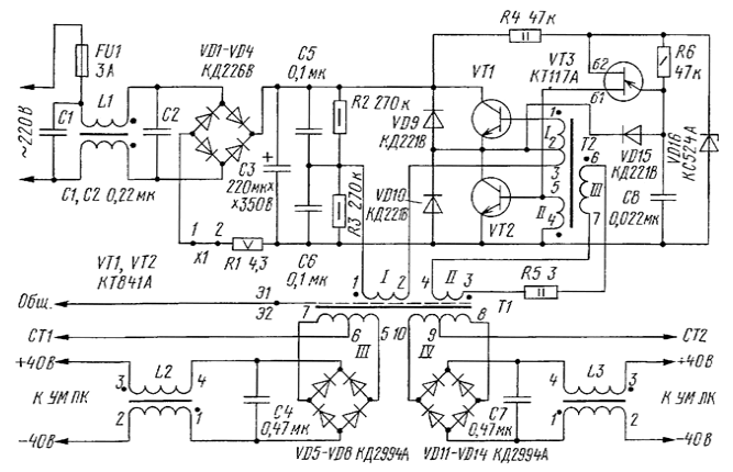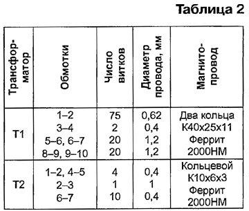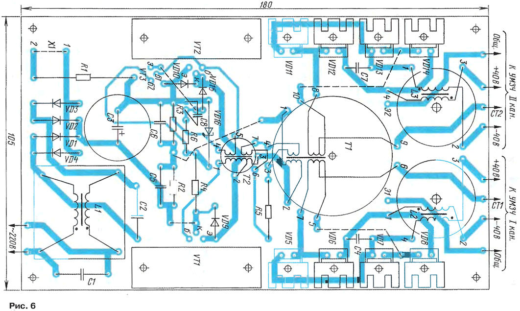 На входе сетевого выпрямителя установлен помехоподавляющии фильтр L1C1C2. Резистор R1 ограничивает бросок тока зарядки конденсатора C3. Последовательно с резистором на плате предусмотрена перемычка Х1, вместо которой можно включить дроссель для улучшения фильтрации и увеличения "жесткости" выходной нагрузочной характеристики. Инвертор имеет два контура положительной ОС: первый - по напряжению (с помощью обмоток II в трансформаторе Т1 и III - в Т2); второй - по току (с трансформатором тока: виток 2-3 и обмотки 1-2, 4-5 трансформатора Т2). Устройство запуска выполнено на однопереходном транзисторе VT3. После запуска преобразователя оно отключается благодаря наличию диода VD15, так как постоянная времени цепи R6C8 значительно больше периода преобразования. Особенность инвертора в том, что при работе низковольтных выпрямителей на большие емкости фильтра он нуждается в плавном запуске. Плавному запуску блока способствуют дроссели L2 и L3 и в некоторой степени резистор R1. Блок питания выполнен на печатной плате из односторонне фольгированного стеклотекстолита толщиной 2 мм. Чертеж платы показан на рис. 6. Намоточные данные трансформаторов и сведения о магнитопроводах приведены в табл. 2. Все обмотки выполнены проводом ПЭВ-2. Перед намоткой трансформаторов острые кромки колец необходимо притупить наждачной бумагой или бруском и обмотать лакотканью (для Т1 - сложенные вместе кольца тремя слоями). Если этой предварительной обработки не сделать, то не исключено продавливание лакоткани и замыкание витков провода на магнитопровод. В результате резко возрастет ток холостого хода и разогреется трансформатор. Между обмотками 1-2, 5-6-7 и 8-9-10 наматывают проводом ПЭВ-2 0,31 в один слой виток к витку экранирующие обмотки, один конец которых (Э1, Э2) соединяют с общим проводом УМЗЧ. Обмотка 2-3 трансформатора Т2 представляет собой виток из провода диаметром 1 мм поверх обмотки 6-7, впаянный концами в печатную плату. Дроссели L2 и L3 выполнены на броневых магнитопроводах БЗО из феррита 2000НМ. Обмотки дросселей намотаны в два провода до заполнения каркаса проводом ПЭВ-2 0,8. Учитывая, что дроссели работают с подмагничиванием постоянным током, между чашками необходимо вставить прокладки из немагнитного материала толщиной 0,3 мм. Дроссель L1 - типа Д13-20, его можно выполнить также на броневом магнитопроводе Б30 аналогично дросселям L2, L3, но без прокладки, намотав обмотки в два провода МГТФ-0,14 до заполнения каркаса. Транзисторы VT1 и VT2 закреплены на теплоотводах из ребристого алюминиевого профиля с размерами 55x50x15 мм через изолирующие прокладки. Вместо указанных на схеме можно использовать транзисторы КТ8126А Минского ПО "Интеграл", а также MJE13007. Между выходами БП +40 В, -40 В и "своей" средней точкой (СТ1 и СТ2) подключены дополнительные оксидные конденсаторы К50-6 (на схеме не показаны) емкостью по 2000 мкФ на 50 В. Эти четыре конденсатора установлены на текстолитовой пластине размерами 140x100 мм, закрепленной винтами на теплоотводах мощных транзисторов. Конденсаторы С1, С2 - К73-17 на напряжение 630 В, C3 - оксидный К50-35Б на 350 В, С4, С7 - К73-17 на 250 В, С5, С6 - К73-17 на 400 В, С8 - К10-17. Импульсный БП подключают к плате УМ в непосредственной близости к выводам конденсаторов С6-С11. В этом случае диодный мост VD5-VD8 на плате УМ не монтируют. Для задержки подключения акустических систем к УМЗЧ на время затухания переходных про
