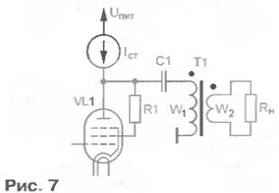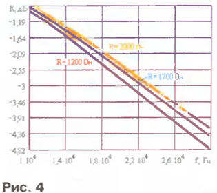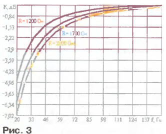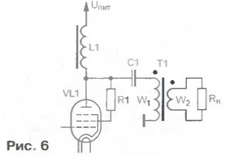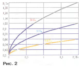 Здесь приведены усредненные данные, одинаковыми у трансформаторов оказались, к сожалению, только надписи на катушках. Материал магнитопровода остался неизвестен, но после снятия кривых намагничивания я склоняюсь к мысли, что это сталь Э44 (высоколегированная, предназначенная для работы в средних полях повышенной частоты). В принципе, что есть - то есть, но для расчетов надо было иметь стартовую точку. Оценим, какие параметры можно ожидать при использовании таких трансформаторов. Чаще всего их применяли в простых усилителях с выходными лампами 6Ф5П, 6ФЗП, 6П1П, 6П14П в триод-ном включении. В этом случае выходное сопротивление ламп находится в интервале 1,3...2 кОм. Для расчетов примем усредненное значение - 1,7 кОм. На рис. 1 показана упрощенная эквивалентная схема трансформатора, подключенного к лампе, которая представлена как генератор G1 с выходным сопротивлением R, (все приведено к первичной стороне трансформатора). Параметры большого сигнала Посмотрим, как обстоят дела с индукцией в магнитопроводе. Так как индукция обратно пропорциональна частоте, то наиболее интересна именно область низких частот, где она достигает максимальных значений. Фактически, допустимая индукция определит максимальную мощность, которую может передать трансформатор в области низких частот при приемлемых искажениях. Амплитуда индукции в магнитопроводе определяется по известной формуле где E1 - напряжение, приложенное к первичной обмотке, В; f - частота сигнала, Гц; S - активная площадь сечения магнитопровода. см2; W1 - число витков. Эту зависимость удобно сразу выразить через мощность в нагрузке. Напряжение Е1, приложенное к первичной обмотке, равно сумме напряжений на нагрузке R2' и на сопротивлении обмотки г2' Индуктивностью рассеяния Ls2' на низких частотах можно пренебречь. Следует учесть, что через первичную обмотку протекает ток покоя лампы I0, создающий намагничивающее поле, которое, в свою очередь, определяет начальное значение индукции В0. По моим расчетам, оно приблизительно равно 0,3Т. После преобразования формула принимает вид Для расчетов вручную эта формула чересчур громоздка, но при компьютерных вычислениях громоздкость не имеет значения. Рассчитанные для трех значений частоты зависимости индукции от выходной мощности показаны на рис. 2. Если учесть, что материал магнитопровода начинает насыщаться при индукции около 1,15Т (это выяснилось при снятии основной кривой намагничивания), и допустить максимальную индукцию, равной приблизительно 0,7 Т, то из графиков видно, какую выходную мощность можно получить в области низких частот: на частоте 30 Гц - всего около 0,25, на 50 Гц - приблизительно 0,8 Вт, а на 100 Гц индукция уже перестает быть ограничивающим фактором. Превышение этих значений не только сильно повышает уровень гармоник, вносимых трансформатором, но и увеличивает уровень гармоник, генерируемых лампой из-за уменьшения входного сопротивления трансформатора. Измерения в реальном каскаде (на лампе 6Ф5П) показали, что при выходной мощности 1 Вт уменьшение частоты сигнала с 1 кГц до 50 Гц приводит к возрастанию уровня гармоник более чем в два раза. Параметры малого сигнала Оценим влияние трансформатора на частотные свойства усилителя при работе его на малой мощности, когда проблем с индукцией нет (например, усилитель предназначен для телефонов). В этом случ