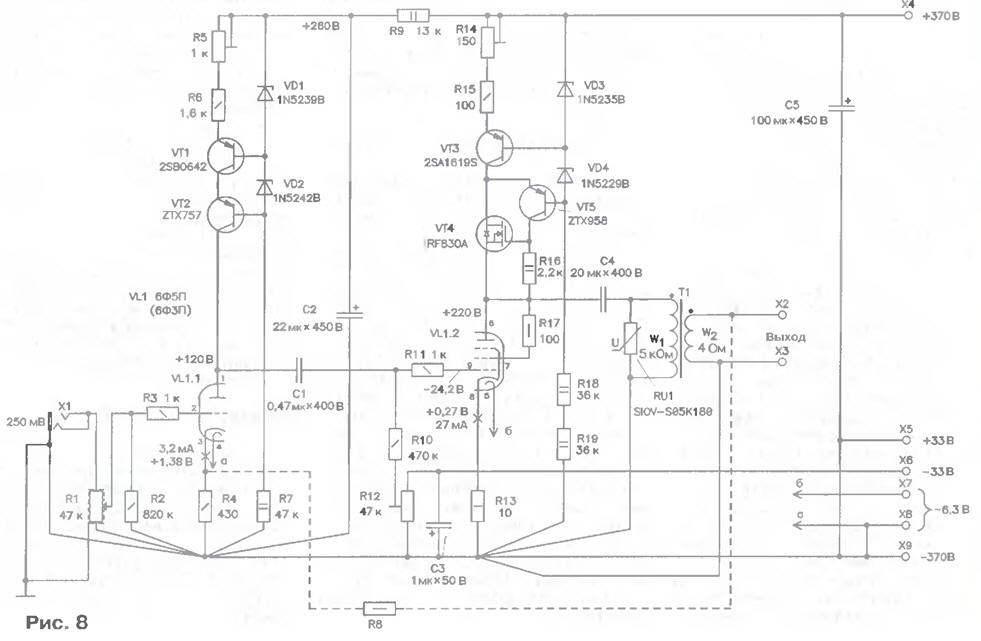 ЭНЦИКЛОПЕДИЯ РАДИОЭЛЕКТРОНИКИ И ЭЛЕКТРОТЕХНИКИ ТВЗ в ламповом УМЗЧ. Энциклопедия радиоэлектроники и электротехники Энциклопедия радиоэлектроники и электротехники / Усилители мощности ламповые В статье дается краткий анализ и определены реально достижимые параметры лампового триодного однотактного усилителя с унифицированным выходным трансформатором ТВЗ от телевизионного приемника. Рассмотрен способ переделки трансформатора, позволяющий улучшить его параметры. Приведены практическая схема усилителя и результаты испытаний. Подход, предложенный автором, может быть применен при разработке более мощных ламповых УМЗЧ. Статья предназначена для радиолюбителей средней квалификации, рекомендации ограничены сведениями, дающими возможность повторить усилитель всем желающим. Разговоры про чудо лампового звука вызывают естественное желание зто чудо услышать. И первая проблема, с которой столкнутся те, кто захочет повторить какой-либо ламповый усилитель, - это выходной трансформатор. Решить ее можно тремя способами. Можно изготовить его самостоятельно, это возможно, но совсем непросто. Можно купить хороший выходной трансформатор, это просто, но совсем недешево. А можно попытаться использовать что-нибудь доступное и недорогое. Изучение радиорынка показало, что наиболее доступны выходные трансформаторы (ТВЗ) от старых телевизоров. Выбор широкий, а цена - от 0 3 до 0,6 долл., в зависимости от настроения продавца. Чаще всего встречаются ТВЗ-1-9, они и были приобретены для экспериментов. Купил я и трансформаторы других типов для сравнения. Как оказалось впоследствии, лучшими параметрами обладают трансформаторы ТВЗ-1 -1 и ТВ-2А-Ш - наиболее почтенного возраста, но ТВЗ-1 9 в продаже было больше, именно с ними я решил экспериментировать дальше. Задача была поставлена следующим образом: попытаться улучшить параметры трансформатора его переделкой (без перемотки), а потом спроектировать выходной каскад таким образом, чтобы максимально скомпенсировать его оставшиеся недостатки. Очевидно, что выходная мощность такого усилителя будет относительно невелика, однако главным было не получение большой мощности, а поиск принципиальных решений. Немного теории Чтобы разобраться, куда надо двигаться, вспомним, какие параметры трансформатора на что влияют. Если обратиться к классикам (например, [1]) то, не вдаваясь в тонкости, можно сказать, что определяющими являются шесть параметров: индуктивность первичной обмотки, амплитуда магнитной индукции, индуктивность рассеяния, собственная емкость, сопротивление обмоток и коэффициент трансформации. Параметры имеющихся трансформаторов были измерены, и вот что получилось: