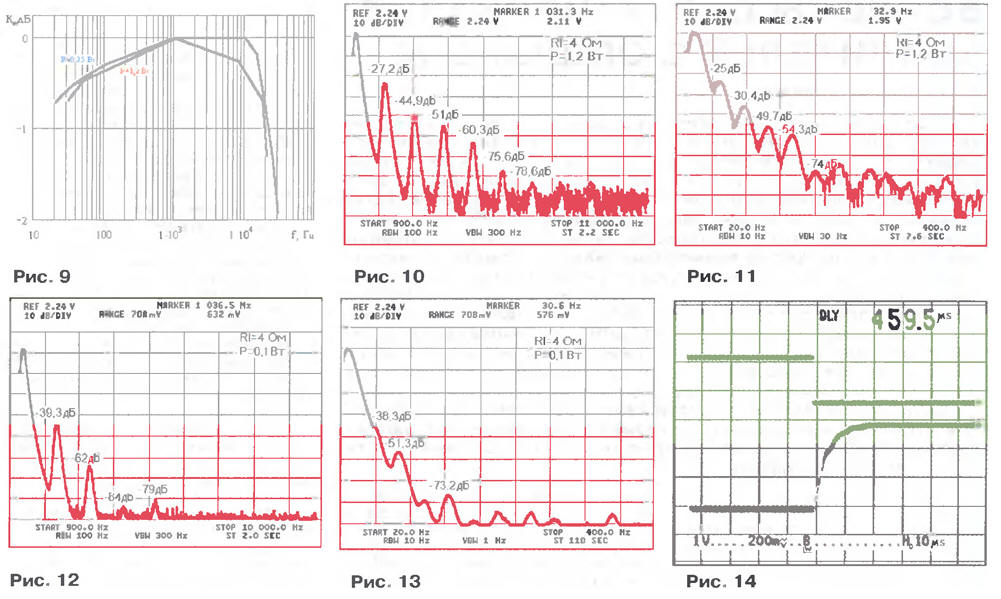 АЧХ усилителя при двух значениях выходной мощности показана на рис. 9. Спектр выходного сигнала частотой 1 кГц при выходной мощности 1,2 Вт изображен на рис. 10, частотой 30 Гц (при той же выходной мощности) на рис. 11 то же, но при выходной мощности 0,1 Вт - на рис. 12 и 13 соответственно. Реакцию усилителя на импульсный сигнал частотой 1 кГц при выходной мощности 1 2В иллюстрирует рис. 14. По сравнению с усилителем с традиционным выходным каскадом и не переделанным трансформатором параметры явно улучшились. Если в области средних и высших частот изменения невелики (на частоте 1 кГц коэффициент гармоник уменьшился приблизительно на 12%) то в области низких частот выигрыш значительный. Произошло заметное расширение полосы в область низших частот при существенно меньшем уровне гармоник (на частоте 50 Гц при мощности 1,2 Вт почти в два раза) При выходной мощности 0,1 Вт коэффициент гармоник на частоте 30 Гц не превышает 1,2 % В спектре выходного сигнала во всех режимах преобладает вторая гармоника, число высших гармоник ограничено и, кроме того, их уровень очень мал. Скорость нарастания выходного напряжения усилителя невелика но здесь мало что можно сделать, большие значения паразитных параметров выходного трансформатора существенно ограничивают возможности коррекции В действие вступает закон "тришкиного кафтана" попытка повысить скорость нарастания приводит к ухудшению других параметров усилителя. Заключение Получившийся усилитель это, конечно, не "Ongaku", но и не говорящая консервная банка неизвестного производства за 20 долл. У него чистый певучий звук. Конечно, небольшая выходная мощность накладывает определенные ограничения на его применение: для озвучивания комнаты средних размеров такой мощности явно недостаточно, но как телефонный усилитель он будет совсем не плох Я бы сравнил этот усилитель с флакончиком пробных духов. Вы сможете сами оценить особенности "лампового" звука и решить, насколько он вам нравится, а не полагаться на мнение других людей. Усилитель можно усовершенствовать. Весьма перспективное направление - использование более "линейных" ламп. Результаты моделирования показали, что применение в выходном каскаде триодов средней мощности позволяет уменьшить коэффициент гармоник на полной мощности еще в полтора-два раза. Но это неизбежно приводит к увеличению числа ламп (которые к тому же дефицитны) и усложнению схемы. Не сошелся свет клином и на трансформаторах ТВЗ. Опытные радиолюбители на основе описанного подхода, используя трансформаторы более высокого качества, могут создавать свои конструкции с гораздо лучшими параметрами Потенциальные возможности выходного каскада с источником тока довольно велики. В заключение хочу заметить, что использование трансформаторов типа ТВЗ - это большой компромисс между качеством и стоимостью. В высококачественном ламповом усилителе необходимо использовать хороший выходной трансформатор. Литература