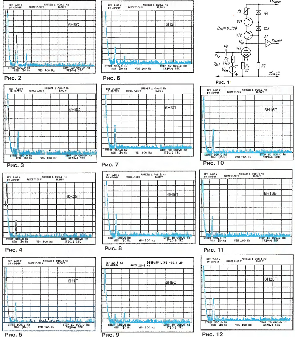 ЭНЦИКЛОПЕДИЯ РАДИОЭЛЕКТРОНИКИ И ЭЛЕКТРОТЕХНИКИ Минимизация гармонических искажений в ламповом усилителе. Энциклопедия радиоэлектроники и электротехники Энциклопедия радиоэлектроники и электротехники / Усилители мощности ламповые В статье рассмотрены результаты исследований линейности лампового каскада с источником тока в анодной цепи. Приведены параметры электрических режимов для ряда усилительных триодов, обеспечивающие наивысшую линейность, и показаны характерные спектры искажений сигнала в этих режимах работы. Даны рекомендации по использованию исследованных ламп. Исследование потенциальной линейности лампового каскада преследовало несколько целей. Предполагалось объективно подтвердить целесообразность использования источников тока в качестве анодной нагрузки лампы и, таким образом, поколебать уверенность противников такого подхода и укрепить веру его сторонников. Мне хотелось еще раз проверить правильность ряда рекомендаций по выбору режима работы предварительных каскадов, приведенных в [1], где подробно описан каскад с источником тока и приведена методика расчета самого каскада и источника тока. Надеюсь, что результаты моей работы облегчат выбор типа лампы и ее рабочего режима всем радиолюбителям и аудиофилам. В отличие от предыдущей статьи [2], где испытания многих ламп проводились в режимах, отличавшихся от реальных, полученные результаты можно сразу использовать на практике. В процессе работы были оптимизированы режимы работы лампы в каскаде с источником тока в анодной цепи, обеспечивающие максимальную линейность. Предположительное назначение каскада - работа в цепях предварительного усиления усилителей мощности; это определило перечень испытываемых ламп и величину выходного напряжения, при котором производились измерения. Измерения параметров проводились в каскаде по схеме, показанной на рис. 1. Фактически схема уже описана [3, 4], каскад дополнен элементами регулирования тока лампы и напряжения смещения. Для исключения влияния входного сопротивления измерительного оборудования использован измерительный буферный усилитель, имеющий очень высокое входное сопротивление и линейность. Обращаю внимание на это условие: в реальных устройствах наилучшие результаты достигаются при использовании катодного повторителя в качестве последующего каскада. В качестве источника сигнала был использован генератор ГЗ-118, а к выходу буферного усилителя (А1) подключались измеритель нелинейных искажений (ИНИ) С6-9 и спектроанализатор НР-3585А. Диапазон изменения рабочих токов лампы ограничен снизу необходимыми частотными свойствами каскада, а сверху - допустимой мощностью рассеяния на аноде. В общем случае верхнюю граничную частоту каскада (по уровню спада на 3 дБ) можно определить по формуле fгр =1/(2πC∑R'). где Су - полная емкость, включенная параллельно нагрузке (в том числе и выходная емкость лампы), R' - полное эквивалентное сопротивление, включенное параллельно анодной цепи лампы по переменному току. Частотные свойства каскада определялись для нагрузки в виде катодного повторителя. В этом случае емкость нагрузки очень мала, а полное эквивалентное сопротивление R' практически равно выходному сопротивлению лампы в точке покоя, которое зависит от тока покоя. Измерения проводились следующим образом: устан