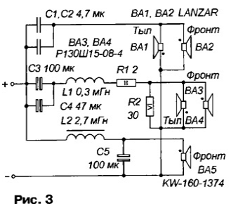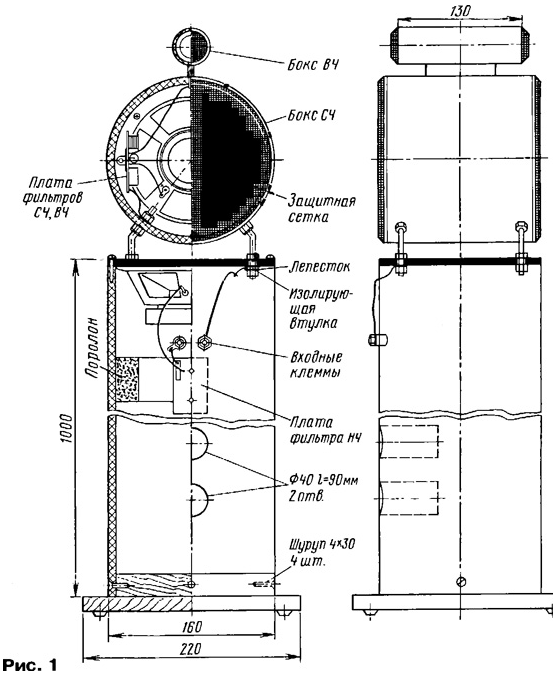 ЭНЦИКЛОПЕДИЯ РАДИОЭЛЕКТРОНИКИ И ЭЛЕКТРОТЕХНИКИ Громкоговорители с дипольными излучателями. Энциклопедия радиоэлектроники и электротехники Энциклопедия радиоэлектроники и электротехники / Акустические системы Автором предложена оригинальная конструкция АС с дипольными излучателями. Конструкция акустического оформления динамических головок, предназначенных в основном для автомобильных АС, изготовлена из пластмассовых труб. Допустимо также использовать трубы из картона или папье-маше достаточной толщины и подходящего диаметра. Для настройки и проверки параметров изготовленной АС автор использовал компьютерную программу SpectraLab. Статьи, опубликованные в последнее время в журнале "Радио", показывают, что уровень разработок конструкций акустических систем аудиофилов поднялся на новую ступень. Очевидно, это не в последнюю очередь связано с доступностью головок более высокого качества. Ныне в продаже наиболее распространены динамические головки для автомобильных АС различной мощности, обеспечивающие достаточно высокое качество звучания. Описываемая в статье акустическая система может быть выполнена с динамическими головками, доступными любителю, и использование готовых комплектов головок для автомобильных АС значительно упрощает их выбор. Целью разработки этой конструкции послужило желание изготовить акустическую систему с хорошим звучанием и оригинальным оформлением; кроме того, интересно было послушать разные варианты акустического оформления головок. В частности, предполагалось сравнить особенное ти звучания биполярных и дипольных громкоговорителей, различающихся диаграммой направленности и фазовой характеристикой излучения (об особенностях их работы - далее по тексту). В результате анализа устройства различных АС (биполярные "Mirage" [1], дипольные "Alon" производства ACARIAN SYSTEMS и др.) автор разработал конструкцию описываемой здесь АС. Корпуса акустической системы (рис. 1) изготовлены из полиэтиленовой трубы с внешним диаметром 160 мм и толщиной стенок 9 мм. Громкоговорители АС - трехполосные; каждый состоит из трех отдельных боксов, объединенных в одной конструкции. Динамическая головка НЧ установлена горизонтально в верхней торцевой плоскости основного бокса. Его внутренний объем снизу (до труб фазоинвертора, выведенных на заднюю сторону корпуса) заполнен синтепоном низкой плотности, а выше труб расположены два кольца из плотного поролона шириной 5 см, уменьшающие стоячие волны в корпусе. Расстояние между кольцами - около 50 см. Установленный над головкой НЧ бокс СЧ одновременно служит "рассеивателем" для излучателя НЧ. Этот бокс выполнен из отрезка аналогичной трубы. Внутренний объем заполнен трехслойной набивкой средней плотности (синтепон-вата-синтепон). С торцевых сторон к нему прикреплены (клеем или винтами) одинаковые установочные пластиковые держатели головок со съемными защитными сетками Крепится бокс, как видно из чертежа, с помощью изогнутых шпилек, пропущенных через выступающие крепления головки НЧ (если таких выступов нет, можно использовать, например, дюралюминиевый кронштейн толщиной 2...3 мм с необходимыми выступами), и через стенки верхнего блока. Высоту крепления бокса регулируют фигурными либо обычными гайками. Бокс ВЧ выполнен из отрезка полиэтиленовой трубы диаметром 40 мм и устан