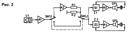 Лучше всего удовлетворяет указанным требованиям УМЗЧ, разработанный и построенный Линчем Маршалом [8]. Этот усилитель сравним с ламповыми усилителями. Соответствующие результаты отражены в таблице. При испытаниях усилители включались по схеме, приведенной на рис.1. Здесь U1 - студийный магнитофон. Z1 - многополосный эквалайзер. А1 и А2 - усилители, качество звучания которых сравнивается. Чтобы не нарушать чистоту эксперимента, в громкоговорителях отсутствовали частотные фильтры, вносящие фазовые искажения. Акустические системы (собственной конструкции) имели громкоговорители ф.Gudmans, характеризующиеся малыми нелинейными искажениями в диапазоне частот 0,03...16.5 кГц. В качестве источника сигнала использовалась программа, записанная на студийной аппаратуре на ленту А4615-6Р со скоростью 38,1 см/с с высококачественной граммофонной пластинки, воспроизводимой проигрывателем "Otophon", встроенным в граммофонное шасси "XL-1550" устройства "Pioneer". Во избежание перегрузки на входах усилителей задавались такие уровни сигналов, чтобы даже при пиковой выходной мощности она оставалась на 3 дБ ниже максимальной. При прослушивании ощущалось превосходство усилителя №1 над усилителями №2 и №3 в отношении "чистоты" и "прозрачности" звуковой картины при передаче высших составляющих звукового спектра. Кроме того, для получения примерно одинакового сбалансированного (по тембру) звучания, характеристика эквалайзера усилителя №1 была равномерна, тогда как при работе с усилителем №2 требовался подъем + 10 дБ в частотном интервале от 1 до 16 кГц. Усилитель №3 уступал по качеству звуковоспроизведения всем остальным. Для ламповых усилителей с №4 и №5 не выработалось единой точки зрения, однако было установлено, что они не имеют никаких преимуществ перед усилителем №1. В этой связи были проведены дополнительные испытания усилителя №1 при включении его в двухполосный ламповый звуковоспроизводящий комплекс с электромеханической обратной связью (ЭМОС) и с полосой пропускания (по звуковому давлению) 0,016...25 кГц. Блок-схема установки приведена на рис. 2. В качестве испытательной нагрузки усилителя №1 (А2 на рис.2) служил резисторный делитель R1-R2, подобранный так, чтобы получить коэффициент передачи, равный 1. Проверка показала, что включение усилителя №1 в аудиокомплекс не приводит к появлению никаких "транзисторных тонов" при воспроизведении разнообразных музыкальных программ. Было установлено, что характеристики УМЗЧ №1 почти совпадают с характеристиками УМЗЧ №2, но имеют существенно более низкий Кни- не превышающий 0.04% в полосе 0,02...20 кГц. Это значение Кни. очевидно, является искомой границей, при которой исчезает "транзисторное звучание*. Взяв за основу изложенные принципы конструирования высококачественной аппаратуры ЗЧ, а также относительно дешевую элементную базу, авторы разработали усилитель мощности, схема которого приведена на рис. 3. Предварительный усилитель состоит из эмиттерного повторителя на транзисторе VT1 и симметричного двухтактного каскада на VT2, VT3, охваченных местной ООС за счет эмиттерных резисторов R11 и R12 и общей ООС, заведенной с коллекторов VT2, VT3 через делитель R1-R2-RP3 на базу VT1. Сигнал ООС складывается там с входным сигналом. Резисторы R2 и RP3 одновременно служат делителем входного сигнала. Коэффициент усиления предварительного усилителя без ОО