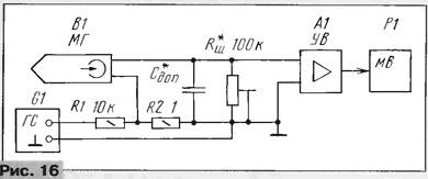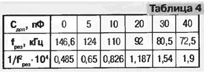 Конечно, возможны и крайности: установка головки ЗД24.751 в магнитофонную панель весьма низкого класса (в магнитоле "Мелодия-106") вместо МГ типа BRG ЗД24.М (Венгрия) совершенно преобразило звучание (как говорят, "не узнать!"). Необходимо также учитывать, что головки, приведенные в табл. 2, не пишут на МЛ M3KIV ("Metal"). При подсчете затрат можно принять, что одна головка из МКФ по долговечности эквивалентна трем из сендаста (срок ограничен полным износом магнитофона). Если покупать на заводе, то стоимость одной головки типа ЗД24.750 колеблется от 20 до 24 рублей в зависимости, где покупать - в отделе сбыта завода "Магнетон" или в магазине завода. На рынке к этому прибавляется "накрутка" дилеров. При настройке магнитофонов с ферритовой головкой проявляются особенности, связанные со свойствами применяемого материала: так, ток подмагничивания в 2...2,5 раза меньше, чем у металлических головок, а высокая добротность приводит к резкому влиянию резонансных явлений на процесс настройки. Параметры ферритов, применяемых для изготовления МГ, приведены в табл. 3. Для сравнения даны параметры некоторых магнитных сплавов (по другим материалам см. также в [10, 11]). Перед установкой МГ желательно определить ее индуктивность Lмг, собственную емкость Смг и добротность Qмг. Раньше завод-изготовитель в паспорте на МГ давал индивидуальные значения Lмг, ЭДС, а также токов записи и подмагничивания. Теперь в паспорте приводятся лишь неоправданно расширенные пределы их значений, что при существенной стоимости головок вызывает только недоумение. Если значения токов можно усредненно взять из табл. 2, то индуктивность требуется определить поточнее. Можно рекомендовать следующую методику измерения Lмг, Смг. Схема измерения приведена на рис. 11. Индуктивность магнитной головки Lмг образует колебательный контур с суммарной емкостью Смг+Спар+Сдоп, где Смг - собственная емкость головки Спар - емкость монтажа; Сдоп - дополнительная емкость. Для измерения желательно иметь 4 - 5 номиналов Сдоп от 5 до 80 пф, известных с точностью не хуже 5%, это непосредственно влияет на точность измерения. Допуск на R1 и R2, входная емкость и входное сопротивление милливольтметра некритичны. Подключение к МГ лучше всего производить с помощью гнезд от подходящего малогабаритного разъема (например, от РГ35-ЗМ и т. п.). Провод подключения к МГ и выводы R1, Сдоп должны иметь минимальную длину для уменьшения Спар. Требуемая погрешность установки частоты генератора составляет 1...2%, выходное напряжение в диапазоне 20...200 кГц - не менее 3 В. Необходимая чувствительность милливольтметра - 3 мВ. Подключая по очереди конденсаторы Сдоп разных номиналов, начиная с малых значений, отсчитывают резонансную частоту контура по минимальному показанию милливольтметра при изменении частоты генератора. Преобразуя известную формулу, получаем CΣ=(2,53/Lмг)x104/f2peз. где СΣ - суммарная емкость, пФ; Lмг - индуктивность, Гн (для ферритовых головок в данном диапазоне частот величина практически постоянная); fpeз - резонансная частота, кГц. Отсюда следует, что между CΣ и 1/f2peз имеется линейная зависимость, по которой можно определить Смг. Делается это следующим образом [12]: