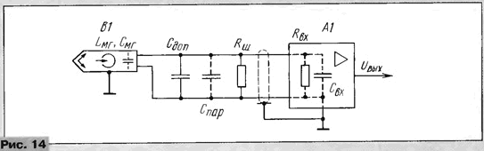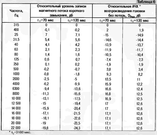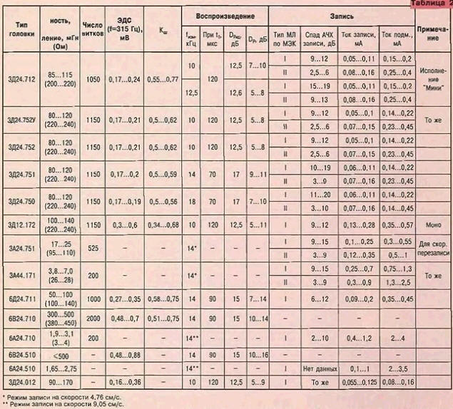 По полученным точкам проводится прямая до пересечения с осью абсцисс. Точка пересечения и дает значение (Смг+Спар). При длине соединений между R1, Сдоп и МГ меньше 2 см емкость Спар может быть принята равной 2пФ. В приведенном примере (Смг+Cпар)=13 пФ. Отсюда находим Lмг = 2,53/(Смг+ Спар) х 04/f2peз. = 2,53/13x0,485 = 0,0944 Гн; Смг=13-2 = 11пФ. Измеренные значения Смг для разных экземпляров головок типа ЗД24.750 - ЗД24.752 лежат в пределах 7...20 пФ. Эта емкость отличается для разных каналов и изменяется в зависимости от подключения общего провода к одному либо к другому выводу МГ Для металлических головок этот метод определения собственной емкости и индуктивности оказывается непригоден из-за их низкой добротности и, как следствие, сильной частотной зависимости индуктивности. Точное измерение Qмг в любительских условиях затруднено. В общем случае добротность контура Q определяют по резонансной кривой (см. [12]): Q=fрез/(fмакс - fмин) где f - частота резонанса, кГц; fмин и fмакс - частоты, при которых напряжение на контуре падает до уровня 0,707Uмакс, кГц. Точность измерения зависит от степени шунтирования контура входными сопротивлениями измерительных приборов, точности отсчета 0,707Uмакс и частот fрез fмин и fмакс. Для измерений с погрешностью до 5% при Q =20...40 необходимо, чтобы сопротивление шунтирования было не менее 10 МОм, а величины fpeз, fмин, fмакс 0,707Uмакс измерялись с погрешностью не более 0,2%. По схеме рис. 11 сопротивление шунтирования примерно равно R1, что дает уменьшение Q на 50...70 %. Использование полевых транзисторов, имеющих большое входное сопротивление, заставляет принимать меры по защите от статического электричества (статический потенциал напряжения на руках оператора относительно земли может достигать 20 кВ!). В практической работе можно ориентироваться на данные измерений, приведенные в табл. 5. Измерения проводились как в диапазоне верхних звуковых частот, так и в диапазоне частот тока подмагничивания. Погрешность измерений - около 5%. При измерениях использовались конденсаторы с малыми потерями, а Смг и Cпар были приняты с большим допущением равными 15 и 6 пФ соответственно. Это допущение и набегающая при вычислениях погрешность дали разброс значений индуктивности Lмг, которые рассчитывались по формуле, приведенной ранее. Резонансное сопротивление параллельного колебательного контура Rpeз и активное сопротивление потерь Rs рассчитывались по формулам [12]: где Rрез - резонансное сопротивление, МОм; Lмг - индуктивность головки, Гн; СΣ- суммарная емкость, пФ; Rs - активное сопротивление потерь, Ом. Для желающих разобраться детальнее рекомендуем [13]. Анализ полученных данных показывает следующее: добротность уменьшается при более широком зазоре МГ и при увеличении СΣ, оставаясь очень высокой (десятки единиц) в области верхних звуковых частот. На частотах тока подмагничивания добротность ферритовых головок также довольно большая (на металлической МГ меньше единицы, замерить не удается). При этом Rpeз таково, что в случае совпадения частоты fpeз с частотой тока подмагничивания в режиме записи выставить номинальные токи подмагничивания при обычной схеме их подачи становится невозможным (получается "перебор"). Rs ферритовых МГ значительно меньше, чем у металлических МГ, например типа ЗД24.211 ("Маяк"), особенно на средних и высших частотах (200 Ом против 3...5 кОм!). Этим объясняется сущест