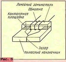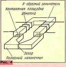 Электромагнитные параметры головок приведены в табл. 2. По головкам ЗД24.012 (ПО ЭВТ, г. Пенза) и 6А24.510 и 6В24.510 (г. Ереван) даны паспортные данные, по остальным - реальные, измеренные на большом количестве головок. Приведены условия измерения в соответствии с [8]. Коэффициент шунтирования Кш характеризует потери в магнитной головке и рассчитывается по формуле где Е - электродвижущая сила (ЭДС) реальной головки, мВ; Енд - ЭДС головки без потерь, мВ. В общем случае Енд = 2п· f ·Ф0·h ·W· 103. где f - частота измерения, Гц; Ф0 - эффективное значение магнитного потока короткого замыкания на 1 м ширины дорожки по [9], Вб/м; h - ширина дорожки, м; W - число витков. Подставляя значения, получаем для кассетных магнитофонов при f=315 Гц, Ф0 = 250 нВб/м, h = 0,6 мм, W = 1000 витков Eнд = 2,97 · 10-4 В; а для катушечных магнитофонов при h = 0,94 мм Eнд = 4,6 · 5-10-4B. Амплитудно-частотная характеристика воспроизведения (АЧХВ) головки без потерь, Dpнд дБ, рассчитывается по формуле Dpнд = 20lg(fизм Jf) + Nизм где fизм - номинальная частота измерения АЧХВ, Гц (верхняя частота); f - опорная частота, равная 315 Гц; Nизм - относительный уровень записи на номинальной частоте измерения по [9]. дБ. В табл. 2 не приведены данные по стирающим головкам (ГС). Это связано с тем, что параметры ГС для катушечных магнитофонов приведены в [1], а отечественные ГС для кассетных магнитофонов не представляют интереса, поскольку изготавливаются из прессованного феррита и нещадно обдирают ленту. Кроме того, эти головки не работают с лентой МЭК IV ("Metal"). Качественное размагничивание таких лент - тема отдельной статьи. Есть особый класс стирающих головок, применяемых в дешевых зарубежных аппаратах, - головки на постоянном магните. Сердечник из высококоэрцетивного феррита намагничивают по специальному закону, получая знакопеременное спадающее магнитное поле. Число полюсов от трех до десяти и более. Качество стирания невысокое: повышенные шумы и нелинейные искажения. У нас такие головки используются в магнитофонах "Электроника-402С", "Электроника 331С" и их модификоциях (производство в г. Зеленограде и г. Воронеже). Что же касается головок для записи и воспроизведения, то завод "Магнетон" (г. С.-Петербург) выпускал их с магнитопроводом как из ГПФ или ИПФ, присваивая им индекс "П", так и из МКФ с индексом "М". С середины 80-х годов по результатам испытаний головки выпускаются только из МКФ. ПО ЭВТ (г. Пенза) выпускало головки из ГПФ 10000 МТ-1 (феррит производства завода "Магнетон"). Ереванский завод выпускает головки из ГПФ собственного изготовления. Ферритовые головки, поступающие на наш рынок из-за рубежа, практически все, даже считающиеся высококлассными (Hitachi, Sony, JVC), изготовлены из ГПФ или, в лучшем случае, из ИПФ. Ферритовые головки (табл. 2) изготавливаются по двум конструктивным схемам (рис. 4,5): с "П"-образным и с линейным замыкателями. Первая конструкция имеет больший объем перемагничиваемого материала, чго приводит к повышенной нелинейности воспроизведения сигналов с малым уровнем записи ("ферритовому звуку"), но зато позволяет разместить обмотку с большим числом витков. Применяется в головках для катушечных магнитофонов. Вторая же конструкция (рис 5) обеспечивает хорошую линейность при воспроизведении, но число витков при этом ограничено размерами окна под обмотку и внешними габаритами МГ. Одно время считалось, что при такой конструктивной схеме невозмо