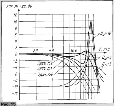 Определим верхнюю частоту fвepx для разных типов выпускаемых ферритовых МГ, исходя из требования необходимой неравномерности АЧХ канала воспроизведения. Типовые АЧХ каналов воспроизведения для трех типов МГ без учета коррекции на верхних частотах показаны на рис. 15. Эти АЧХ получены по данным для МГ ЗД24.750 - ЗД24.752 (см. рис. 13). Накладывая на эти кривые при разных спадах АЧХ резонансные кривые входного контура, можно убедиться, что приемлемая неравномерность суммарной АЧХ получается, если за fвepx принять частоту, на которой спад АЧХ без коррекции не превышает -10 дБ. Для 3Д24.752fвepx = 14...16 кГц, для ЗД24.751 fвepx = 16...18 кГц, а для ЗД24.750 fвepx = 18...20 кГц. На рис.15 приведены резонансные кривые от уровня -10 дБ на частоте 20 кГц при Qш, равной 10, 3 и 2, а также вид суммарной АЧХ канала воспроизведения. Как видно, оптимальная коррекция верхних частот для МГ ЗД24.750 происходит при величине Qш между 2 и З. Поэтому при установке ферритовой МГ в магнитофон, если в УВ есть регулировка коррекции верхних частот (кроме формирования стандартных постоянных времени τ1 и τ2), и/или цепи положительной обратной связи для увеличения добротности входного контура [17] нужно вывести их регулировки на минимум. После этого параллельно МГ надо подключить в качестве Rш малогабаритный подстроечный резистор с номиналом в пределах 80...100 кОм, установив его максимальное значение и отключив имеющийся в УВ шунтирующий резистор. При установке МГ, кроме обычно проверяемых наклона (азимута), центровки и "кивка" головки, необходимо проверять глубину вхождения МГ в кассету. Из-за чрезмерного прижима ленты к рабочей поверхности, кроме повышенного износа МГ, возникают и фрикционные "свисты", особенно если рабочая поверхность загрязнена следами клея от липкой ленты, которой приклеиваются ракорды. Проверку удобнее всвго проводить с помощью кассеты, в верхней крышке которой сделан вырез в том месте, где головка входит в кассету. Зона контакта рабочей поверхности с магнитной лентой должна лежать в пределах 3,5...4,5 мм симметрично по отношению к зазору. Если при включении аппарата УВ возбуждается, необходимо уменьшить величину Rш до исчезновения возбуждения. Верхняя частота берется либо равной fBepx конкретного типа МГ, либо занижается, если магнитофон не обеспечивает необходимой стабильности азимута движения магнитной ленты или УВ имеет ограничение по верхней частоте. Настройка входного контура на эту частоту производится подбором Сдоп. Ввиду высокой износостойкости головок из МКФ (износ 3 мкм за 1000 ч) подстройки в пpo-цессе эксплуатации не требуется. Частота резонанса определяется по максимуму выходного сигнала УВ при подаче магнитного поля сигнала в зазор МГ с помощью катушки на рамке-формирователе по [9]. Каркас такой рамки имеет размеры 8x75x3 мм, число витков - 20±5 проводом ПЭВ 0,2. Сигнал с генератора подается через ограничительный резистор 100 Ом. Этот способ не требует нежелательных паек на платах магнитофона. Магнитное поле в зазор можно также подавать с помощью гибкого проводника, наклеенного на рабочую поверхность МГ в области зазора (клеить удобно спирторастворимым клеем типа БФ-6). Наиболее удобно настройку на fвepx и АЧХ канала воспроизведения производить с помощью сигналограммы измерительных лент типа ЗЛИТ1.4.4-120 [9], состоящей из пачек частотных посылок. Частота повторения пачек 18 Гц, длительность о
