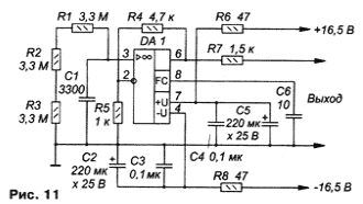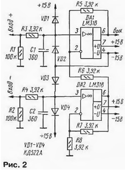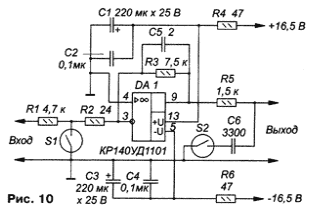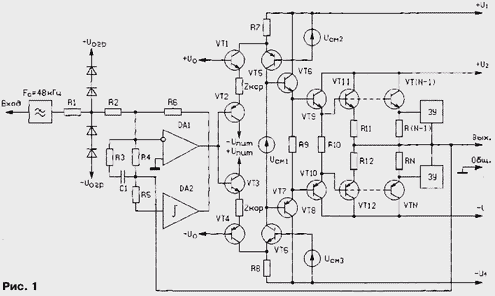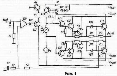 ЭНЦИКЛОПЕДИЯ РАДИОЭЛЕКТРОНИКИ И ЭЛЕКТРОТЕХНИКИ Сверхлинейный УМЗЧ с глубокой ООС. Энциклопедия радиоэлектроники и электротехники Энциклопедия радиоэлектроники и электротехники / Усилители мощности транзисторные Можно ли на отечественных компонентах создать усилитель, который бы успешно конкурировал с любым фирменным? Автор публикуемой статьи на этот вопрос ответил утвердительно. Причем в УМЗЧ он использовал биполярные транзисторы и операционные усилители. На отечественных компонентах этот сверхлинейный усилитель с глубокой и широкополосной обратной связью обеспечивает долговременную мощность до 150 Вт на нагрузке 4 Ом. Применением импортных компонентов можно увеличить мощность в нагрузке 8 Ом до 250 Вт. Он способен работать на комплексную нагрузку, имеет защиту от перегрузки по входу и выходу. Интермодуляционные искажения УМЗЧ настолько малы, что автор вынужден был измерять их на радиочастотах. Конструкция и печатная плата, разработанные автором, представляют образец для обучения "разводке" монтажа широкополосных устройств. Некоторое время назад среди аудиофилов и радиолюбителей преобладало мнение, что по-настоящему высококачественный УМЗЧ обязательно должен быть выполнен на лампах. В качестве обоснования высказывалось много суждений. Однако, если отбросить совсем уж надуманные, то останутся всего два. Первое - искажения, вносимые ламповым усилителем, приятны на слух. Второе - нелинейности в ламповых усилителях более "гладкие" и дают значительно меньше продуктов интермодуляции. Надо сказать, что и то, и другое подтверждается практикой. Более того, давно существует даже специальный прибор обработки звука - эксайтер, действие которого основано именно на внесении искажений четных порядков в высокочастотную часть спектра. В ряде случаев применение эксайтера позволяет улучшить проработку инструментов и голосов второго-третьего плана, придать дополнительную глубину звуковой сцене. Подобный эффект в усилителе может быть приятен, иногда даже полезен. Тем не менее внесение "хорошо звучащих" искажений все-таки относится скорее к прерогативе звукорежиссера, нежели самого УМЗЧ. Что же касается достижения верности звуковоспроизведения, то с этой точки зрения необходимо добиваться устранения искажений, вносимых усилителями и громкоговорителями. Тема снижения искажений, вносимых громкоговорителями, была ранее затронута в статье [1]. Здесь же речь пойдет о "классических" УМЗЧ с малым выходным сопротивлением, поскольку они все же более универсальны, чем УМЗЧ с "токовым" выходом. С первого взгляда может показаться, что при сегодняшнем уровне техники спроектировать усилитель "прозрачным" совсем несложно, и дебаты вокруг этой проблемы - лишь плод рекламной шумихи. Отчасти так оно и есть: если наладить массовый выпуск безупречного УМЗЧ, то спустя некоторое время отрасль промышленности, производящая эти усилители, на мой взгляд, попросту останется без сбыта. Автору этих строк приходилось разрабатывать ламповые и транзисторные прецизионные усилители для измерительной техники, ремонтировать и настраивать различную аппаратуру - преимущественно зарубежного производства. Естественно, проводились измерения параметров и оценка конструкций. Причем не только по стандартным (для звуковой техники) методикам, но и по более ин