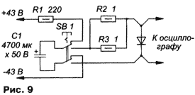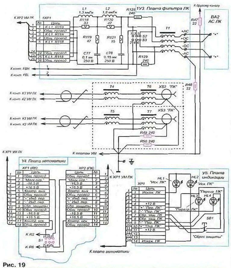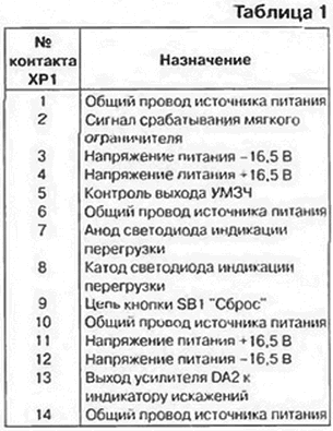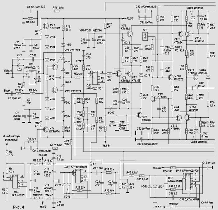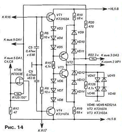 Выводы К0, К1 - общий питания К2 - общий сигнальный, КЗ - вход сигнальный; FBH - выход +ОС; FBL - выход -ОС. Плата рассчитана на установку более распространенных мощных транзисторов КТ818Г и КТ819Г до 12 штук на плечо. В связи с этим увеличено число транзисторов во второй ступени повторителя (VT20-VT27B) с четырех до шести на плечо, а также увеличены токи покоя VT16-VT27B. Кроме того, потребовалось изменить номиналы ряда резисторов: R76. R77 теперь - 130- 150 Ом (вместо 390 Ом). R78-R81 - по 8,2-to Ом (вместо 15 Ом). Номинал R64, R66 также имеет смысл уменьшить до 10 Ом. Транзисторы VT16-VT19 надо снабдить пластинчатыми теплоотводами из алюминиевого сплава толщиной 1,5...2 мм и площадью поверхности не менее 25 см^ - по одному на каждую пару транзисторов. Для VT13 и VT14 также предусмотрены небольшие теплоотводы (8...10 см^). Для уменьшения нагрева VT13. VT14 можно также слегка увеличить номиналы R59 и R63 до 160 Ом (вместо 150 Ом). Далее, номиналы R82-R85 снижены до 13 Ом (вместо 68 Ом), a R86 - R93 - до 3,3 Ома (вместо 4,7 Ома). Изменения коснулись также номиналов цепей коррекции - С16 теперь имеет емкость 470 пФ (вместо 270). R25 и R26 - по 2.7 кОм (вместо 4,7 кОм и 1 кОм соответственно). R33 теперь имеет номинал 47 Ом (вместо 220). R38 и R44 - по 2.2 кОм (вместо 2 кОм). R64 и R66 - по 10 Ом (вместо 15). Конденсаторы С17. С18 могут быть либо заменены одним трубчатым на 3-3,3 пФ, либо двумя по 6,2 пФ (при необходимости подбирается по виду переходного процесса). Для увеличения минимального падения напряжения на VT20-VT43 при открывании VD26, VD27 желательно последовательно с эмиттером транзисторов VT16-VT19 включить по диоду типа КД521А в прямом направлении. На плате места для них нет. поэтому диод удобнее всего впаять в разрыв между соответствующим выводом эмиттера и контактной площадкой. В дополнение к индикации искажений собственно УМ (вызываемых "жестким" ограничением выходного сигнала) введена возможность индикации срабатывания "мягкого" ограничителя. Это достигается за счет изменения его схемы (см. рис. 14). При срабатывании "мягкого" ограничителя на резисторе R126 появляется напряжение соответствующего знака, абсолютная величина которого достигает величины 0,6 В при превышении порога мягкого ограничения всего на 90... 100 мВ. Дальнейшее увеличение этого напряжения выше 1,2...1,3 В блокируется диодами VD46-VD49. Кроме того, предусмотрена возможность вывода выходного каскада ОУ DA 1 в режим класса "А" для снижения его нелинейности и эффектов детектирования ВЧ помех при работе на относительно низкоомную (3.5 кОм) нагрузку. Источник тока величиной 4...6 мА выполнен на полевом транзисторе VT46 типа КП303Е или КП364Е и резисторе R125 (около 150 Ом). Поскольку искажения КР140УД1101 и без источника тока весьма малы и не вносят чрезмерного вклада в общий уровень искажений УМЗЧ. установка VT46 и R125 необязательна. При установке VT46 необходимо проверить его пробивное напряжение сток-затвор, оно не должно быть меньше 40 В. Для предельного уменьшения паразитной индуктивности монтажа выводы транзисторов выходного каскада VT20-VT43 запаяны непосредственно в печатную плату. Эта мера вызвана тем. что паразитная индуктивность эмиттерного вывода мощного транзистора снижает его фактическую граничную частоту. С учетом этого становится очевидным, что для реализации быстродействия даже сравнительно "медленных" выходных транзисторов с граничной частотой 5...8 МГц необходимо всемерное снижение паразитной индуктивности монтажных проводн