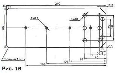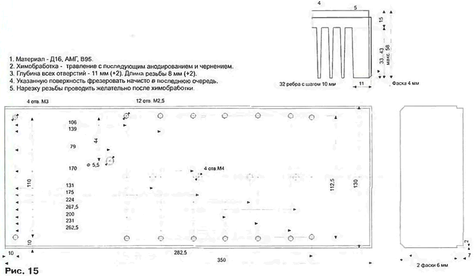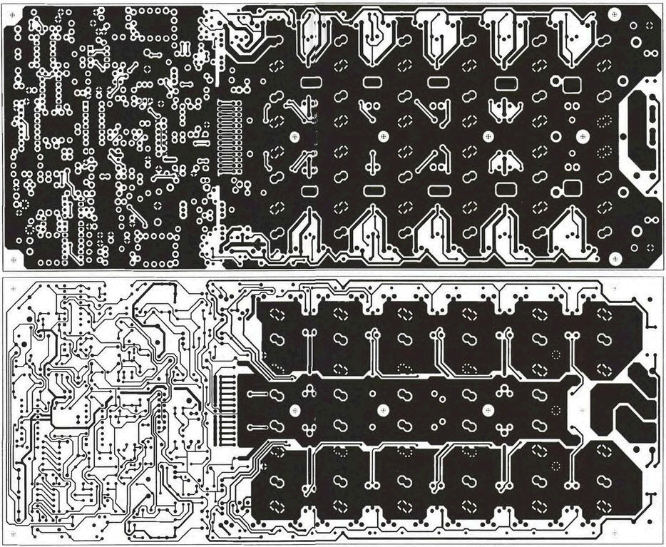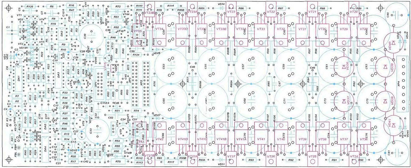 ОСОБЕННОСТИ ПЕЧАТНОЙ ПЛАТЫ И МОНТАЖА УСИЛИТЕЛЯ На рис. 13 представлено расположение элементов на плате одного канала (см. рис. 12). Помимо большинства элементов, указанных на принципиальной схеме (рис. 4). на плате предусмотрена установка ряда дополнительных компонентов. Для сохранения соответствия нумерации прежних и новых элементов на плате им присвоены очередные порядковые номера или буквенные индексы, например, VT23A. R86B.