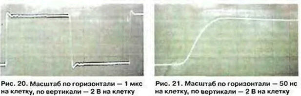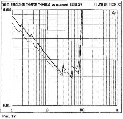 Усилитель напряжения, следующий за ОУ DA3, имеет высокую линейность за счет симметричности структуры и весьма глубокой (более 40 дБ) местной ООС. Цепи этой ООС совместно с R71C46 и DA3 использованы также для формирования требуемой АЧХ петлевого усиления УМЗЧ в целом. В таком каскаде есть одна тонкость: для минимизации потерь усиления падение напряжения на резисторах в эмиттерных цепях последних транзисторов каскода (на рис. 4 это - R59, R63) должно быть не менее 2,5 В, или же эти резисторы следует заменить на источники тока. В противном случае ухудшается линейность усилителя напряжения. Заметим, что в УМЗЧ, описанных в [5] и особенно в [3], это условие не выполняется. С целью дальнейшего повышения линейности (особенно на высоких частотах) напряжение питания усилителя выбрано на 10...12 В большим, чем напряжение питания выходного каскада. Диоды VD17-VD19 предназначены для ускорения переходных процессов при выходе усилителя из перегрузки, а также для защиты от деградации эмиттерных переходов транзисторов VT5-VT8. Цепи R64C41, R66C42 исключают паразитное самовозбуждение VT13 и VT14, а диоды VD26, VD27 предотвращают насыщение транзисторов выходного каскада (эти диоды должны выдерживать обратное напряжение не менее 100 В при токе 10 мкА; большинство экземпляров КД521А или 1N4148 этому условию удовлетворяют). Необычная схема параллельного включения транзисторов в первых двух каскадах повторителя обеспечивает эффективное выравнивание токов через транзисторы, избавляя от необходимости их подбора. Конденсаторы С45, С47-С49 предотвращают появление динамической асимметрии выходного каскада. Стабилитрон VD25 задерживает включение транзисторов VT13 и VT14 во время зарядки накопительных конденсаторов источника питания, чтобы к моменту их включения напряжение питания ОУ достигло +5...7 В и они вошли в нормальный режим. Эта мера предотвращает скачки выходного напряжения при включении питания. С этой же целью диапазон автоподстройки нуля на выходе УМЗЧ ограничен величиной +0,7 В. Может показаться необычным последовательное соединение резисторов в цепях ООС (R23, R24, цепи R27C17 и R28C18, а также R45, R46). Это сделано с целью снижения нелинейности цепей ООС (величины сопротивления резисторов и емкости конденсаторов, хотя и в весьма малой мере, зависят от приложенного к ним напряжения). По той же причине резисторы R23, R24, а также R122 и R123 выбраны с большим запасом по мощности рассеяния. Среди других заслуживающих внимания особенностей следует отметить устройство начального смещения на базы трехкаскадного повторителя, построенное на VT15 (он смонтирован на радиаторе выходных транзисторов) и резисторах R60-R62 и R65. Температурный коэффициент напряжения смещения выбран несколько больше обычного для учета разницы в температуре радиатора и кристаллов мощных транзисторов. Не совсем обычно использование конденсатора C40. Отсутствие этой детали в большинстве конструкций приводит к динамическому изменению напряжения смещения и росту нелинейности усилителей на сигналах со скоростью нарастания или спада более 0,2...0,5 В/мкс. А это весьма существенно сказывается на величине интермодуляционных искажений в области высших частот. Кстати, использование в качестве VT15 "медленного" транзистора (типа КТ502 или КТ209) предотвращает еще один часто возникающий, но редко замечаемый дефект - самовозбуждение транзистора на частотах п
