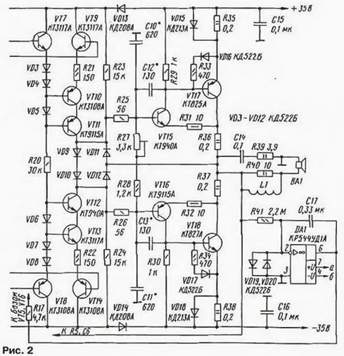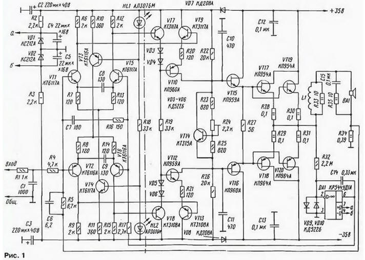 Усилитель выполнен по схеме "двойное моно, т. е. с отдельными блоками питания на трансформаторах с кольцевым магнитопроводом. Такая конструкция обеспечивает более высокие динамические характеристики и позволяет избежать возникновения перекрест ных помех между каналами, что существенно улучшает пространственную характеристику звукопередачи. Емкости конденсаторов на выходах источника питания должны быть не менее 20000 мкФ. Катушку L1 наматывают на резисторе R33 (МЛТ-2) проводом ПЭВ-2 0.69 виток к витку в один слой до заполнения. Конденсаторы С2-С5 - К50-35. Резисторы R28-R31 изготовлены из манганинового провода диаметром 0.3 мм. В качестве DA1 можно использовать микросхемы КР544УД1. К140УД8. а также КР544УД2 с соединением выводов 1 и 8. Транзисторы VT15, VT16 снабжены небольшими теплоотводами, а транзисторы VT14, VT17 - VT20 закреплены на пластинчатых теплоотводах из дюралюминия толщиной не менее 5 мм. Выходные транзисторы каждого плеча усилителя подключают к плате свитыми проводниками сечением 1 мм2 минимальной длины. Провода, идущие к источнику питания и к громкоговорителю, также должны быть свиты. Транзисторы желательно предварительно подобрать по парам с разбросом п2|э не более 20 %. При исправных деталях налаживание усилителя сводится к установке тока покоя каждого иэ выходных транзисторов в пределах 60... 100 мА. Выходные каскады усилителя с низким выходным сопротивлением, более подходящего для громкоговорителя нч. выполнены на более доступной элементной базе (рис. 2). Остальная часть схемы практически аналогична рассмотренной ранее (на рис. 1 она отделена штрихпунктирной линией). Двухтактный выходной каскад на VT15-VT18 выполнен по схеме ОЭ-ОЭ с глубокой ООС. Цепь смещения на диодах VD9. VD10 дополнена резисторами R23, R24, которые обеспечивают малые изменения входного сопротивления каскада и тока через диоды VD9, VD10 даже при отсечке тока в противоположном плече каскада. Защита от короткого замыкания в нагрузке выполнена на диодах VD11, VD12. В качестве VT7, VT9, VT13 можно использовать транзисторы типа КТ3102 с любым буквенным индексом. При напряжении питания до ±30 В в качестве VT11, VT16 подойдут транзисторы типа КТ626В, a VT12. VT15 - КТ646А. Транзисторы VT15, VT16 снабжены небольшими пластинками - теплоотводами. Для дополнительной термостабилизации диоды VD16, VD17 монтируют вместе с резисторами R33. П34 непосредственно на выводах выходных транзисторов. При использовании в позициях VT11, VT12, VT15, VT16 транзисторов серий КТ850. КТ851 емкость конденсаторов С10, С11 можно уменьшить до 150 пФ, а С12, С13 - до 39 пФ. Для повышения устойчивости усилителя желательно включить в базы транзисторов VT10, VT12 (см. рис. 1) и VT10-VT13 (рис. 2) резисторы сопротивлением 50-100 Ом. что позволит уменьшить емкости конденсаторов С10-С13 или даже отказаться от них. При налаживании усилителя (сначала без мощных транзисторов VT17, VT18. см. рис. 2) его включают и. подав сигнал от генератора, убеждаются в работоспособности устройства без нагрузки. Затем, подключив выходные транзисторы, проверяют его под резистивной нагрузкой как с помощью синусоидального сигнала, так и сигнала "меандр" до частоты 20 кГц. Выходной сигнал должен быть чистым, без какого-либо выброса или "звона". Особое внимание следует обратить на форму выходного сигнала при выходе усилителя из перегрузки по напряжению. На синусоидальном сигнале не должно быть никаких признаков даже кратковременног