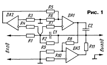 В качестве примера МКУС рассмотрим схему (рис. 1) трехканального инвертирующего усилителя, предназначенного для работы на маломощную нагрузку. Здесь ОУ DA1 (соответственно скорректированный) - основной канал усилителя, задающий частоту замыкания петли ООС (Fзам), а усилители DA2 и DA3 образуют дополнительные каналы, действующие по критерию подавления сигнала соответственно на входе и выходе DA1. Итак, сигнал, пришедший через резисторы R1, R7 на вход ОУ DA1, усиливается и через конденсатор С2 поступает на выход усилителя. Элементы С1, R2 и R1 образуют петлю ООС. Дополнительно сигнал усиливается по каналу DA2, а также DA3, с которого проходит на общий выход через резистор R11. Таким образом, в отношении низкочастотных сигналов усиление внутри петли ООС существенно возрастает. Делители сигнала R5R6 и R8R9 обеспечивают приоритет основного канала (DA1), снижая усиление DA2 и DA3 до уровня, при котором дополнительный фазовый сдвиг, вносимый этими ОУ, без проблем компенсируется основным каналом. Здесь следует руководствоваться правилом: уменьшать (делить) сигнал следует именно на входе дополнительных каналов усиления, что существенно улучшает их перегрузочные характеристики. Исключение могут составлять лишь усилители, подключенные к входу (DA2), в силу ухудшения отношения сигнал/шум. Резисторы R4 и R7 улучшают входные перегрузочные характеристики. Аналогичные функции, хотя и косвенно, выполняют элементы R3 и R10; они существенно уменьшают усиление входных каскадов ОУ, особенно вблизи Fзам. Здесь надо подчеркнуть, что такие резисторы устраняют эту проблему, так как частотная коррекция ОУ по стандартной методике, как правило, не защищает входные каскады ОУ от перегрузки ВЧ сигналом. При отсутствии этих резисторов высокочастотные продукты искажений через конденсатор С1 поступают непосредственно на входы ОУ и перегружают их (форсируется усиление на частотах, близких к Fзам). В свою очередь, глубокая ООС по ВЧ (через конденсатор С1) создает на частоте F1 ОУ DA1 большой спад АЧХ усилителя. Таким образом, обеспечиваются высокие перегрузочные характеристики как по выходу DA1, так и по входу DA3, и как следствие - всего усилителя в целом. На звуковых частотах сигнал последовательно усиливают три ОУ - DA2, DA1, DA3 (они также могут быть выполнены по технологии МКУС). Применение ОУ упрощает реализацию конструкции, хотя не возбраняется применение как высокочастотных, так и СВЧ транзисторов. Переходя к варианту УМЗЧ, весьма заманчиво использовать мощный усилитель (далее УНЧ) в качестве DA3, при высоком выходном сопротивлении которого резистор R11 можно было бы исключить. Возможно и другое решение: вместо элементов С2 и R11 использовать более эффективное устройство согласования (многоканальное), тогда УНЧ можно выполнить в виде отдельного блока! Это дает возможность снизить уровень наводок и помех на 20...40 дБ. Что касается прочих узлов усилителя, то здесь технологически целесообразно применение предельно широкополосных (радиочастотных) ОУ, допускающих работу со стопроцентной ООС. Другими словами, крайне малое время прохождения сигнала и соответственно минимальный фазовый сдвиг на частоте единичного усиления - решающие параметры при выборе ОУ. Весь спектр аргументов достаточно сложен, и поэтому выбор пал на относительно средний широкополосный ОУ. Разумеется, использование ультрасовреме