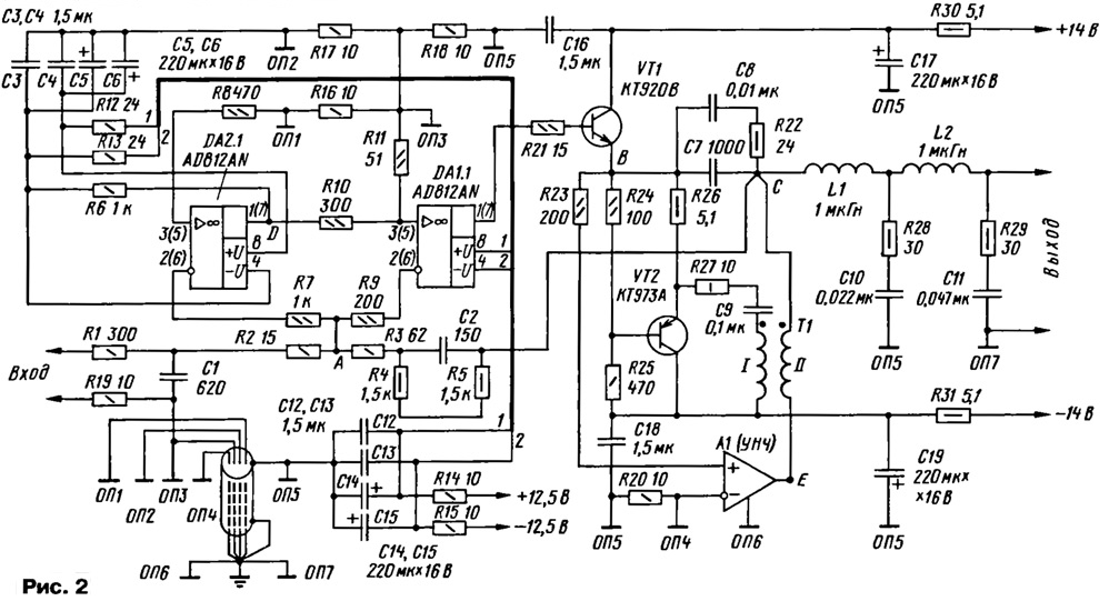 При необходимости в первую очередь регулируют усиление и коррекцию УНЧ (элементы R35, R34, С22, С25), коэффициент ослабления сигнала устройства приоритета (R23, R32, С20, С21) и после этого настраивают согласующее устройство (С7, С8 и R22, С9 и R27, Т1), исключая колебательный процесс установления сигнала на выходе DA1 (точка В). Далее подключают и подбирают резистор R10 по критерию минимума амплитуды импульсов на выходе DA2 при высокой линейности (плавности) последних. После чего выбирают номинал на 10...20 % больше и впаивают на плату. Регулируют ток покоя выходного каскада УНЧ на уровне около 100 мА подбором резистора R48 ток срабатывания блокировки УНЧ (8 А) - R63, а ток покоя транзистора VT1 (200 мА) - R25 соответственно. И наконец, проверяют работу УМЗЧ на отсутствие возбуждения УНЧ при перегрузке большим входным сигналом в полосе 30...300 кГц. Возбуждение УНЧ свидетельствует о его весьма низких скоростных и перегрузочных свойствах, о большом усилении на F^, о излишне высокой частоте среза петли ООС или недостаточном приоритете основного канала, что возможно при изменении компонентов. После настройки восстанавливают частоту среза петли ООС. Конструкция и детали Именно главный канал определяет время задержки петли слежения ООС, усиление на высоких частотах и, как следствие, эффективность подавления разного рода паразитных резонансов и искажений. Таким образом, наиболее жесткие требования предъявляются к DA1: он должен быть радиочастотным, т. е. корректно работать при большом уровне ВЧ сигнала и при штатной нагрузке 50 Ом. Высокие требования предъявляются и к транзистору VT1, также вносящему временную задержку. Поэтому он должен быть высокочастотным (например, из серий КТ922, КТ925), а его ток достаточным для работы с ОУ DA1. В силу относительно небольшого тока VT1 (200 мА) импеданс нагрузки УМЗЧ на частотах выше 1 МГц должен быть больше, причем наличие фильтра (дросселя L1) обязательно. Другое назначение L1 - преградить проход высокочастотных колебаний от АС на выход УМЗЧ (в точку С) и далее в цепь ООС. Из-за очень высокой частоты замыкания петли ООС физическая длина основного канала усиления и цепи ООС на ВЧ должна быть минимальна, а реализация - с учетом требований к ВЧ устройствам. Требования к ОУ DA2 менее жесткие, но следует подчеркнуть, что именно ОУ DA2 является предварительным усилителем, определяющим уровень шума, помех, прецизионность работы ООС, и. как следствие, он обязан работать в "тепличных" условиях. Условия следующие: наличие относительно высокоомного резистора во входной цепи (R7), что исключает перегрузку ОУ на частотах, близких к частоте Fзам; работа выходного каскада ОУ в малосигнальном режиме класса А; наличие отдельного источника питания или RC-фильтров в цепях питания для снижения помех. В конструкции важно наличие отдельных общих проводов: сигнального ОП1 и цепи питания ОП2. "Вопрос о "земле" очень важен, ибо сигнал в каскадах усилителя определяется по отношению к общему проводу [8]. Наводка НЧ помехи на сигнальную часть или сигнальный общий провод фактически идентична. Поэтому цепи ОП1 -ОП4 должны быть в экране (он же провод ОП5) и обязательно выполнены отдельными проводами. Экранировать следует и каскад на ОУ DA2 Резисторы R16-R20 обеспечивают более короткий путь замыкания токов ВЧ в обход общей точки замыкания всех ОП на корпус УМЗЧ. Высокие требования предъявляются к к