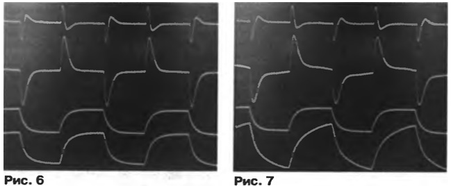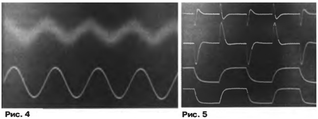 Контроль и настройку УМЗЧ следует осуществлять в полосе 100 МГц. Для этого целесообразно увеличить частоту среза петли ООС, уменьшив в два раза сопротивления резисторов R1 и R4+R5. После, отключив DA2 (для этого достаточно отпаять один из выводов R10), в точке С контролируют монотонный спад его АЧХ на частотах выше 1 МГц. При необходимости снижают усиление основного канала DA1, увеличивая сопротивление R9 Далее подают на вход импульсный сигнал "меандр" с частотой 250 кГц при размахе напряжения 0,5 В. Больший уровень сигнала подавать нет смысла, так как выходная мощность УМЗЧ на частотах выше 250 кГц сильно увязана с мощностью выходного каскада основного канала усиления (VT1, VT2). При этом наиболее информативным следует считать предыскаженный сигнал с выхода DA1 (точка В), который, по сути, является многократно усиленным сигналом ошибки петли слежения ООС. Сигнал в точке В должен иметь импульсный характер с формой, близкой к экспоненте. При корректной настройке импульсы должны быть относительно короткими, их фронты - крутыми, а спады - пологими и плавными. На их осциллограммах ни в коем случае не должно наблюдаться каких-либо резонансов или изломов. Импульсные сигналы в разных точках УМЗЧ, измеренные при удвоенной частоте среза, показаны на осциллограммах рис. 5, при работе на резистивную нагрузку сопротивлением 4 Ом - на осциллограммах рис. 6; при работе на реактивную нагрузку (конденсатор емкостью 1 мкФ) - на осциллограммах рис. 7. Соответственно сверху вниз: выход DA2 (точка D) при цене деления 0,2 В, выход DA1 (точка В) при цене деления 2 В, выход УМЗЧ (точка С) и выход УНЧ (точка Е) при цене деления 5 В. Скорость развертки для этих осциллограмм - 1 мкс наделение