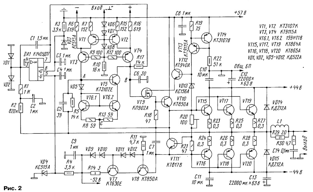 ЭНЦИКЛОПЕДИЯ РАДИОЭЛЕКТРОНИКИ И ЭЛЕКТРОТЕХНИКИ УМЗЧ с симметричным входом без общей ООС. Энциклопедия радиоэлектроники и электротехники Энциклопедия радиоэлектроники и электротехники / Усилители мощности транзисторные Усилитель отличается использованием петли местной обратной связи компенсационного типа, уменьшающей искажения выходного каскада. Применение высоколинейного входного каскада исключило необходимость введения общей ООС, а его симметрия в широкой полосе частот практически устраняет влияние внешних наводок на усилитель. Преимущества УМЗЧ с общей ООС хорошо известны и не раз были рассмотрены в специализированной литературе [1] и на страницах журнала "Радио". Однако, несмотря на высокие технические характеристики, их реальное качество звуковоспроизведения нередко далеко от идеала, тогда как относительно простые УМЗЧ без общей ООС (или с ООС до 20 дБ) отличаются более естественным звучанием, чем УМЗЧ с глубокой ООС. Разработчики пришли к выводу, что главным виновником являются динамические искажения, связанные с неудачным выбором и реализацией АЧХ и ФЧХ каскадов усилителя, охваченного глубокой ООС. В аудиоиндустрии возникло даже отдельное направление - это усилители с малокаскадным сигнальным трактом без общей ООС, а иногда и с компенсацией нелинейных искажений [2]. УМЗЧ этого типа выполняют на специально отобранных лампах или транзисторах, работающих в классе А или АВ с большим током покоя, и характеризуются высокой стоимостью. Разработчики таких УМЗЧ используют только высококачественные компоненты, входные каскады строят по симметричным (балансным) схемам, а для достижения малого выходного сопротивления применяют большое число мощных транзисторов с подобранными параметрами, что, собственно, и обеспечивает повторяемость заявленных характеристик УМЗЧ. В предлагаемом УМЗЧ без общей ООС применен симметричный входной каскад на основе повторителя тока [3]. Схема УМЗЧ функционально проста и включает усилитель напряжения и усилитель тока. Такая структура соответствует одному из принципов High End audio - минимум "электрической длины", т. е. минимум каскадов усиления и компонентов в сигнальном тракте. В усилителе используется местная обратная связь, уменьшающая искажения выходного каскада. При разработке УМЗЧ основное внимание уделялось сокращению числа усилительных каскадов и повышению исходной линейности усилителя напряжения. Особенность УМЗЧ - это отсутствие усилительных каскадов, выполненных по схеме с общим эмиттером (ОЭ) или с общим истоком (ОИ). Известно, что дифференциальный каскад обычно представляет собой пару транзисторов, включенных по схеме с ОЭ или ОИ [1], и вносит заметные нелинейные искажения [4]. Используя схемы включения с общей базой (ОБ), общим коллектором (ОК) и общим стоком (ОС) совместно с малой длиной усилительного тракта, удалось создать УМЗЧ без общей ООС с параметрами, которые не уступают параметрам промышленных изделий. Высокие параметры усилителя достигаются за счет чисто схемных решений и, в отличие от характерного для High End экзотического и материаловедческого подходов, не требуют применения дорогостоящих компонентов. УМЗЧ имеет низкоомный симметричный вход (1200 Ом) и предназначен для работы с источниками сигнала, имеющими симметричный регулируемый выход. Для полной реализации