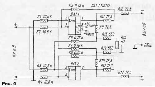 В УМЗЧ можно использовать отечественные и импортные компоненты. Транзисторы КТ9115А (VT3, VT4) лучше подобрать в пары с одинаковым коэффициентом усиления по току (еще лучше - применить согласованные пары высоковольтных транзисторов структуры p-n-р, выполненных на одной подложке). Вместо КТ9115А можно применить КТ632Б или импортные приборы 2SA1184, 2N5415. Вместо 159НТ1В можно использовать любую согласованную пару транзисторов структуры n-p-n (критерий выбора - возможно больший h21Э). В УМЗЧ вместо КП902А хорошо работают маломощные МОП-транзисторы серии КП305. Резисторы R5-R8, R13 и R15-R17 - С2-29, причем R6 и R16, R7 и R15 с возможно меньшим допуском (в авторском варианте эти резисторы имеют допуск 0,05%). Остальные резисторы - МЛТ и С5-16МВ. Катушка L1 содержит 9 витков изолированного провода диаметром 1,53 мм, намотанного с шагом 2,5 мм на оправке диаметром 10 мм. Конденсаторы - КМ-6, К73-16, К73-17. Из-за особенностей подключения источника сигнала к входу УМЗЧ нужно изменить и принцип "заземления" корпуса усилителя. С металлическим корпусом конструкции следует соединить шину "+57 В" стабилизированного источника питания УМЗЧ. Общий провод источника сигнала подключают к этой же точке общего провода. Общий провод цепей питания и конденсаторов фильтра питания необходимо изолировать от корпуса усилителя. Также нужно изолировать и выходные клеммы УМЗЧ. Если в УМЗЧ применены два раздельных и полностью независимых блока питания для каждого из каналов, то их шины питания "+57 В" следует соединить в одной точке с корпусом УМЗЧ. Средние точки блоков питания соединять между собой не надо. В случае архитектуры типа "двойное моно" два канала УМЗЧ соединены между собой (и с корпусом конструкции) только через шину питания +57 В, что при отсутствии общих сильноточных цепей благоприятно сказывается на развязке между каналами. Этот вариант УМЗЧ проектировался для работы с профессиональным микшерным пультом, не имеющим на выходе разделительных конденсаторов (выход по постоянному току). При таком способе "питания" через входные резисторы УМЗЧ всегда потребляет от источника сигнала небольшой постоянный ток (около 2 мА по каждому входу). В других случаях для нормальной работы УМЗЧ также потребуется источник звукового сигнала с симметричным низкоомным выходом и возможностью регулировки уровня сигнала. При отсутствии источника сигнала, имеющего симметричный выход, можно использовать любой несимметричный источник сигнала, дополнив его устройством, которое преобразует несимметричный сигнал в симметричный. Сегодня существует достаточно много вариантов устройств, реализующих эту функцию: от простейших на основе симметрирующего трансформатора до специализированных микросхем, например, SSM2142. Для этих же целей автор иногда использовал устройство, известное как "Di-Box" (Active Direct Inject Box), модель Dl 100 фирмы Behringer. Такие устройства популярны у музыкантов, работающих с "живым звуком", и состоят из высококачественного симметрирующего трансформатора и повторителя напряжения. Вносимые ими нелинейные искажения достаточно малы (обычно менее 0,005 %). На рис. 3 представлена схема "симметратора", выполненная с перекрестно-симметричной ОС на сдвоенных ОУ DA1 (в одном корпусе) и прецизионных резисторах R1- R8. Степень симметрии выходного сигнала зависит от индивидуального разброса парных резисторов и реально потребует дополнит