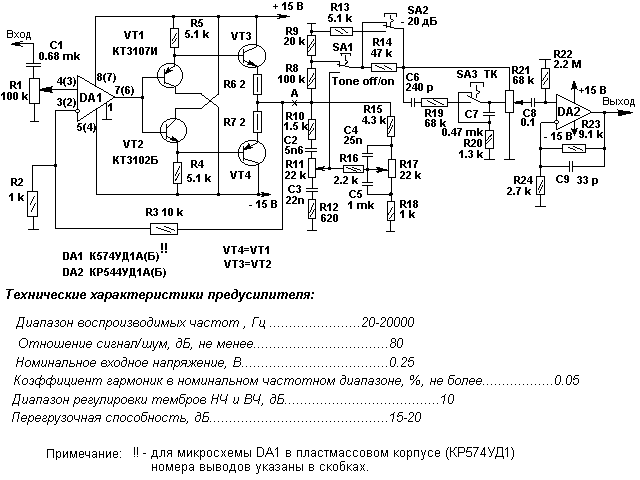 "Ïîñëå äîëãèõ ïîèñêîâ è ñåðèé íåóäà÷", - èìåííî òàê ñî ìíîé ñëó÷èëîñü. ß ïåðåñìîòðåë ñ ñîòíþ âñåâîçìîæíûõ æóðíàëîâ è áðîøþð â ïîèñêàõ ïðèëè÷íîé ñõåìû ïðåäâàðèòåëüíîãî óñèëèòåëÿ è âîò êàæåòñÿ íàøåë... Íå ñêðîþ, â ïðîöåññå ñáîðêè è èñïûòàíèé ïðèøëîñü äîðàáîòàòü ñõåìó - êîå-÷òî óáðàòü è äîáàâèòü.  ÷àñòíîñòè - áûë ââåäåí äîïîëíèòåëüíûé ðåãóëÿòîð óðîâíÿ ñèãíàëà íà âõîäå ÏÓ (R1) ñ åãî ïîìîùüþ âõîäíîé ñèãíàë îñëàáëÿåòñÿ äî íîìèíàëüíîãî óðîâíÿ è òîíîêîìïåíñèðîâàííûé ðåãóëÿòîð ãðîìêîñòè (R21) à òàêæå âîçìîæíîñòü ñòóïåí÷àòîãî îñëàáëåíèÿ ñèãíàëà íà 20 äåöèáåë (SA2).