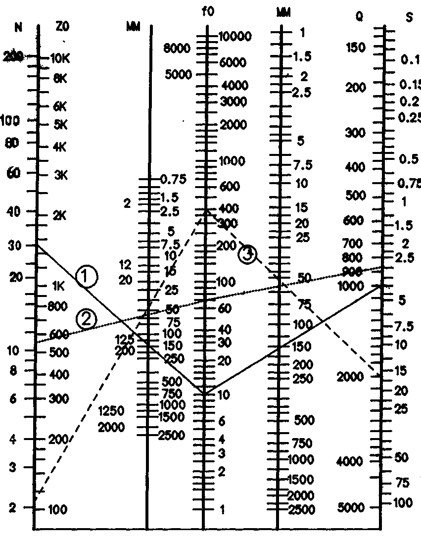 Рассмотрим примеры расчета спиральных резонаторов. Для расчета будем использовать номограмму (рис.2). Первый пример Требуется рассчитать резонатор на частоту 10 МГц и добротность без нагрузки, равную 1000. Соединив линией 1 точку на оси fo=10 МГц с точкой на оси Q= 1000, определим, что внутренний диаметр экрана D=150мм. Зная диаметр D, соединим точку fo=10 МГц с точкой D=150 мм и, продолжив линию до пересечения с осью N, Z0, получим число витков N=30. Выбрав d/D=0,55, получим средний диаметр катушки d =83,5 мм. При этом приемлемыми значениями будут: S=4.5 витка на см, Ь=125 мм, В=200мм. Как видно из расчета, спиральный резонатор на 10 МГц имеет очень большие габариты. Второй пример Требуется рассчитать резонатор на частоту 70 МГц. Добротность ненагруженного резонатора должна быть не менее 850. Резонатор монтируется в экране с квадратным поперечным сечением. Из номограммы видно (линия 2), что экран с круглым поперечным сечением должен иметь диаметр D=60мм. Внутренний размер стороны квадратного экрана равен D/1.2 - 50 мм. Требуемое число витков равно 11. При d/D - 0.55 диаметр катушки будет равен 33 мм. Длина катушки равна 50мм. Длина экрана равна 95мм. Третий пример Рассчитаем резонатор на частоту 400 МГц добротностью без нагрузки Q - 2000. По номограмме определим, что внутренний диаметр экрана D - 50мм, а число витков n - 2.25 витка. Средний диаметр катушки будет равен 27мм, а шаг намотки - 19мм. Длина катушки - 40мм, длина экрана - 55мм. При конструировании спиральных резонаторов необходимо помнить следующее: материал, из которого изготовлен каркас катушки, не должен вносить потерь. Рекомендуется применять полистирол, радиокерамику или фторопласт. Если катушки выполняются толстым жестким проводом или шиной, лучше вообще обойтись без каркаса. Для обеспечения хорошей проводимости желательно применять посеребренный провод и посеребренную внутреннюю поверхность экрана. На частотах до 100 МГц можно применять и обычный медный провод (в том числе и ПЭВ), однако посеребренный провод дает приращение добротности примерно на 3%. Помните, что чистота обработки внутренней поверхности экрана имеет гораздо большее значение, чем последующее серебрение. Экран не должен иметь швов, расположенных параллельно оси катушки, и если таковые существуют, то для обеспечения малого сопротивления контакта их необходимо хорошо пропаивать. Нижний конец катушки должен быть подведен к боковой стенке экрана как можно более прямо и подпаян к ней. В случае, если конец катушки подводится к нижней стенке экрана, последняя для уменьшения потерь в стыках должна быть тщательно припаяна к экрану. Катушка должна доходить до края экрана на расстояние не ближе четверти диаметра экрана. Если катушка будет опущена чрезмерно низко ко дну экрана, то нижние несколько витков будут неэффективны для накопления энергии, внесут значительные потери, что отрицательно скажется на добротности резонатора. Зазор в верхней части экрана служит для уменьшения паразитной емкости и для избежание дугового разряда в мощных резонаторах. Следует помнить, что если спиральный резонатор включен на выходе УКВ передатчика с выходной мощностью 10 Вт, то на конце спирали амплитуда напряжения составит 60-80 кВ. В качестве элемента настройки целесообразно использовать латунный сердечник диаметром от 3 до 8 мм. При настройке следует следить, чтобы сердечник входил не глуб
