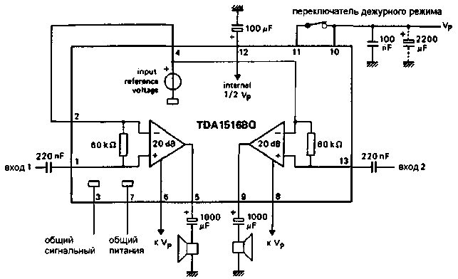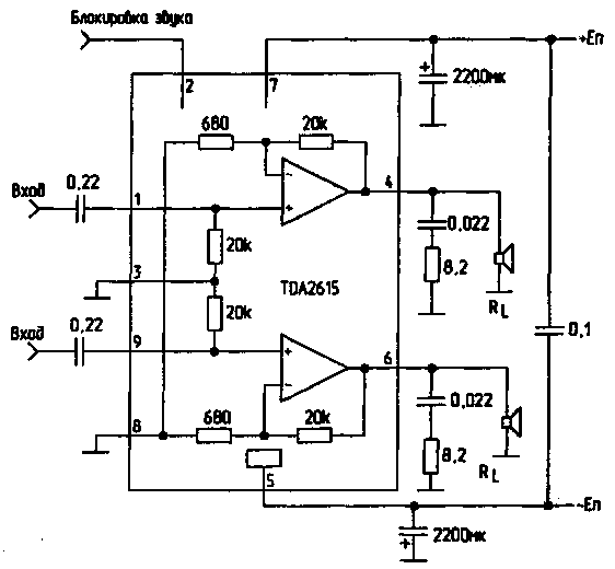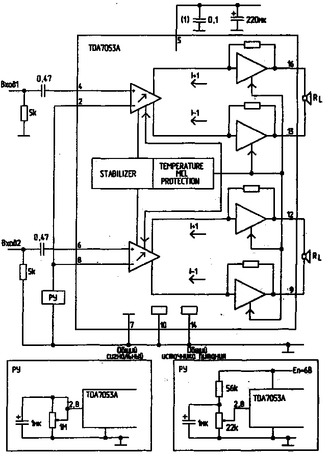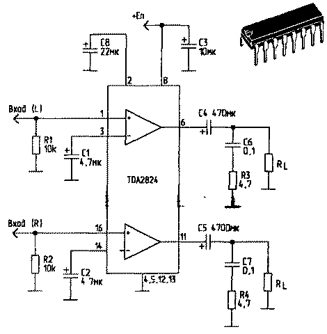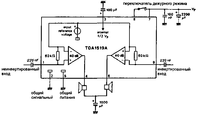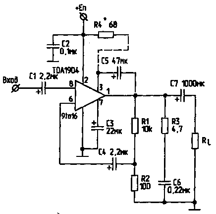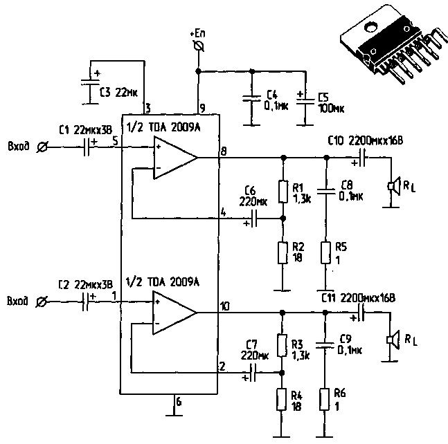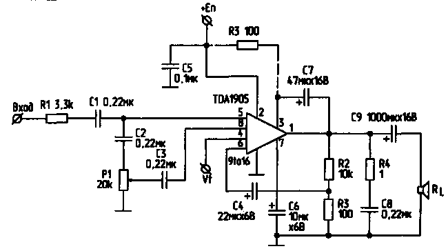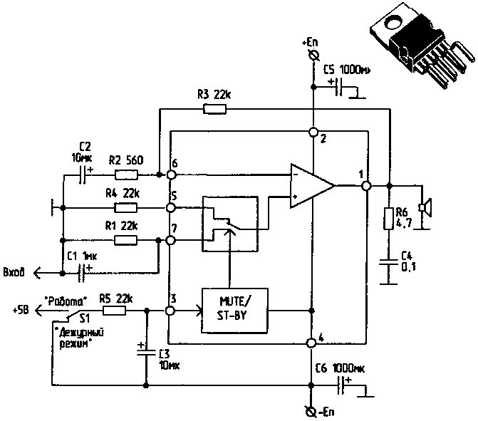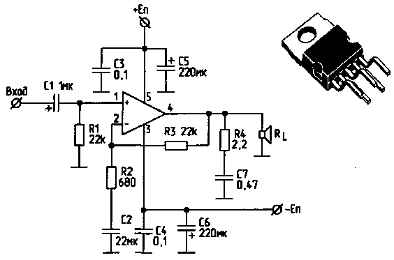 КНИ (Р=1 Вт, RL=4 Ом) - 0,2 % Ток покоя - 14 мА Напряжение питания - 10...40 B Максимальный потребляемый ток - 1,5 A Выходная мощность (КНИ=10%) - 4,2 Вт КНИ (Р=2,5 Вт, RL=8 Ом) - 0,15 % Напряжение питания - 3,6...18 В Максимальный потребляемый ток - 2,5 А Выходная мощность (RL=4 Ом, КНИ=10%):