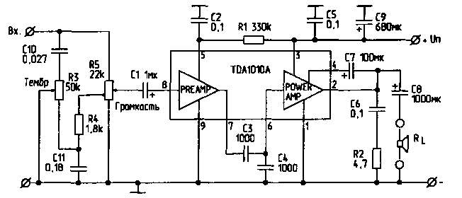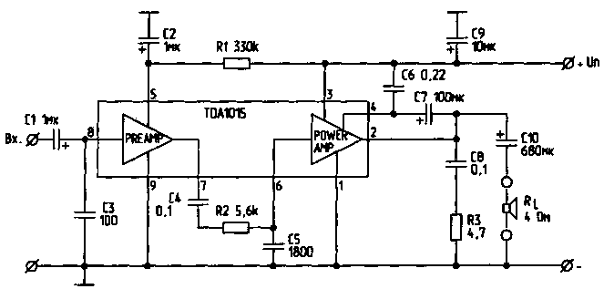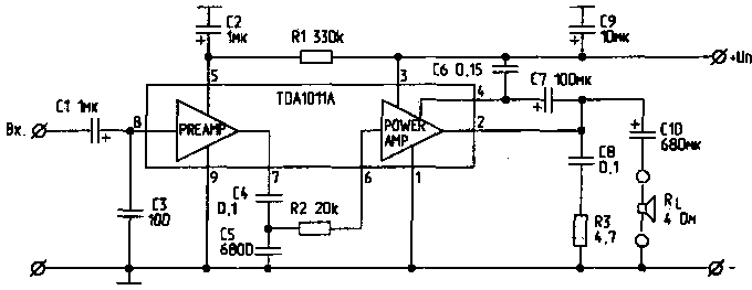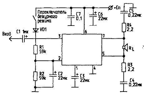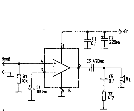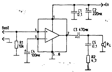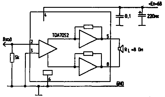 КНИ (Еп=9 В, RL=8 Ом, Рвых=0,5 Вт) - 0,2 % УНЧ с широким диапазоном напряжений питания, предназначенный для работы в носимых радиоприемниках, кассетных магнитофонах и т.д. Напряжение питания - 1,8...16 В Максимальный потребляемый ток - 1,0 А Ток покоя (Еп=6 В) - 9 мА Выходная мощность (КНИ=10%):