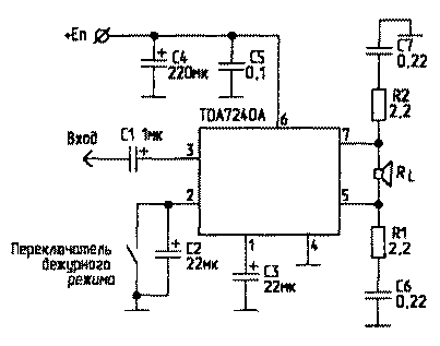 КНИ (Р=1 Вт, RL=4 Ом) - 0,2 % Ток покоя - 31 мА Напряжение питания - 5,4...20 B Максимальный потребляемый ток - 3 A Выходная мощность (RL=4 Ом, КНИ=10%):