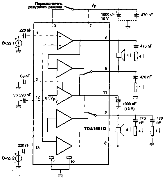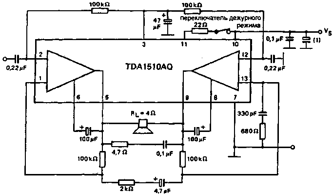 Ток покоя - 160 мА Сдвоенный интегральный УНЧ, разработанный специально для применения в автомобиле и допускающий работу на низкоомную нагрузку (до 1,6 Ом). Напряжение питания - 8...18 В Максимальный потребляемый ток - 3,5 А Выходная мощность (Un=14,4 В, КНИ=10%):