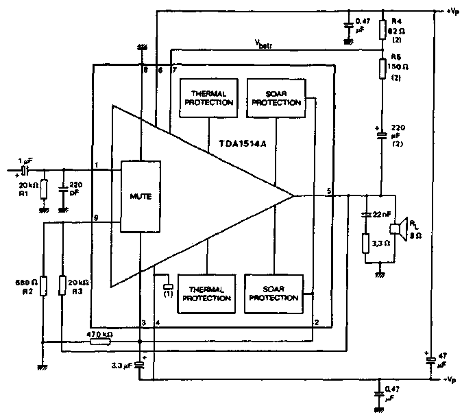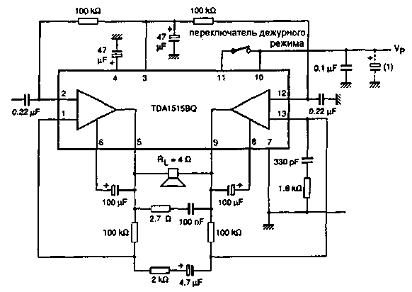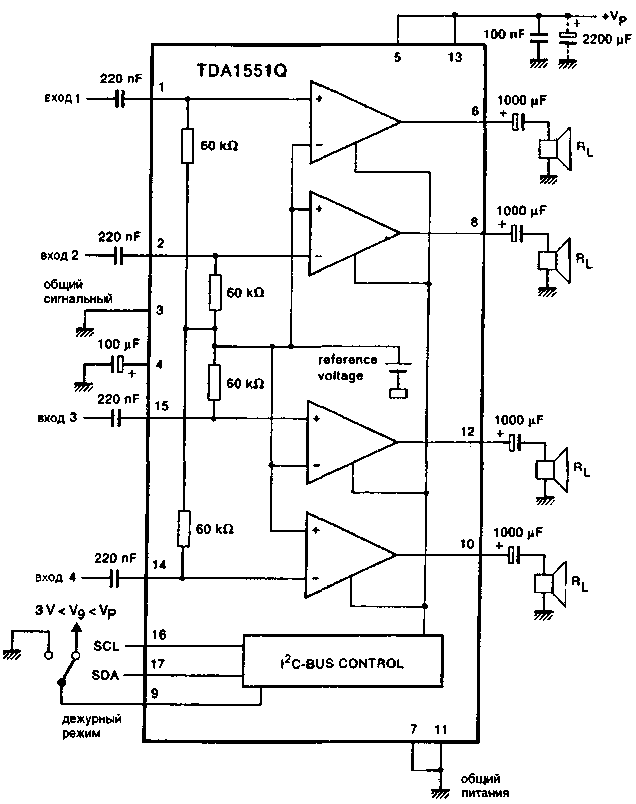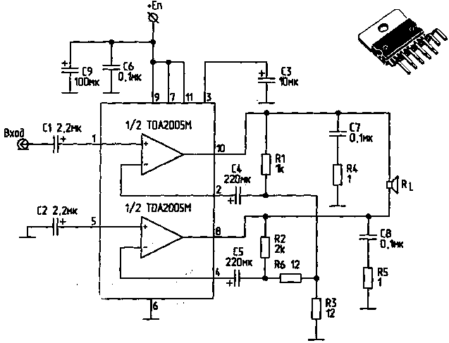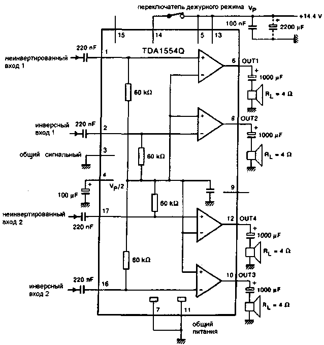(Еп=14,4 В, RL=8 Ом, Рвых=12Вт) - 0,05 % Полоса пропускания по уровню -3 дБ (RL=4 Ом, Рвых=15 Вт) - 30...25000 Гц Мостовой УНЧ, разработанный для применения в автомобильных магнитолах. Имеет защиту от короткого замыкания в нагрузке, а также от перегрева. Максимальное напряжение питания - 18 В Максимальный потребляемый ток - 4,5 А Ток покоя (Еп=14,4 В) - 80 мА Выходная мощность (Еп=14,4 В, КНИ=10%):