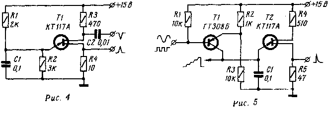 Эквивалент однопереходного транзистора может быть построен из двух обычных транзисторов с разным типом проводимости, как показано на рис. 3. Здесь ток, протекающий через делитель, состоящий из резисторов R1 и R2, создает на втором из них падение напряжения, закрывающее эмиттерный переход транзистора Т1. При увеличении напряжения на эмиттере транзистор Т1 начинает пропускать ток в базу транзистора Т2, в результате чего он также открывается. Это приводит к снижению напряжения на базе транзистора Т1, что, в свою очередь, вызывает еще большее открывание его и т. д. Другими словами, процесс открывания транзисторов в таком устройстве также протекает лавинообразно и вольтамперная характеристика устройства имеет вид, аналогичный характеристике однопереходного транзистора. Устройства на однопереходных транзисторах Однопереходные транзисторы (двухбазовые диоды) широко применяются в различных устройствах автоматики, импульсной и измерительной техники - генераторах, пороговых устройствах, делителях частоты, реле времени и т. д. Одним из основных типов устройств на однопереходных транзисторах является релаксационный генератор, схема которого показана на рис. 1. При включении питания конденсатор С1 заряжается через резистор R1. Как только напряжение на конденсаторе становится равным напряжению включения однопереходного транзистора Т1, его эмиттерный переход открывается и конденсатор быстро разряжается. По мере разряда конденсатора эмиттерный ток уменьшается и при достижении величины, равной току выключения, транзистор закрывается, после чего процесс повторяется снова. В результате на базах Б1 и Б2 возникают короткие разнополярные импульсы, которые и являются выходными сигналами генератора. Частоту колебаний f генератора можно рассчитать по приближенной формуле: где R - сопротивление резистора R1, Ом; С-емкость конденсатора С1, Ф; η- коэффициент передачи однопереходного транзистора. При заданной частоте колебаний емкость конденсатора следует выбрать возможно большей с тем, чтобы получить на нагрузке (R2 или R3) сигнал с нужной амплитудой. Важным достоинством генератора на однопереходном транзисторе является то, что частота его колебаний незначительно зависит от величины питающего напряжения. Практически изменение напряжения от 10 до 20 В приводит к изменению частоты всего на 0,5%. Если вместо резистора R1 в зарядную цепь включить фотодиод, фоторезистор, терморезистор или другой элемент, изменяющий свое сопротивление под действием внешних факторов (света, температуры, давления и т. д.), то генератор превращается в аналоговый преобразователь соответствующего физического параметра в частоту следования импульсов. Несколько изменив схему, как показано на рис. 2, этот же генератор можно превратить в устройство сравнения напряжений. В этом случае базовые цепи транзистора подключают к источнику эталонного напряжения, а зарядную цепь - к исследуемому источнику. Когда напряжение последнего превысит напряжение включения, устройство начнет генерировать импульсы положительной полярности. В устройстве, схема которого показана на рис. 3, конденсатор заряжается через резистор R4 и сопротивление участка эмиттер - коллектор биполярного транзистора Т1. В остальном работа этого генератора не отличается от описанного ранее. Зарядный ток, а, следов